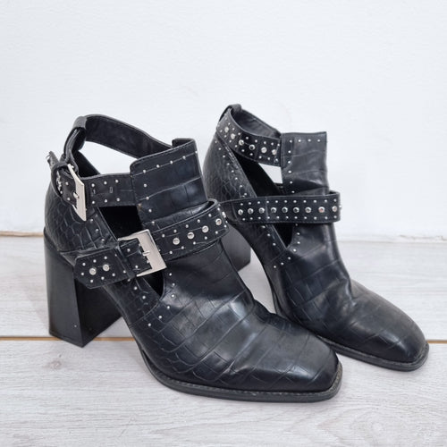 Zara Boots Buckles Studded Ankle Black Faux Crocodile Leather Cutout UK 7 EU 40