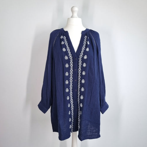 Yours Cheesecloth Embroidered Shirt UK 20 Navy Blue Tunic Button 100% Cotton