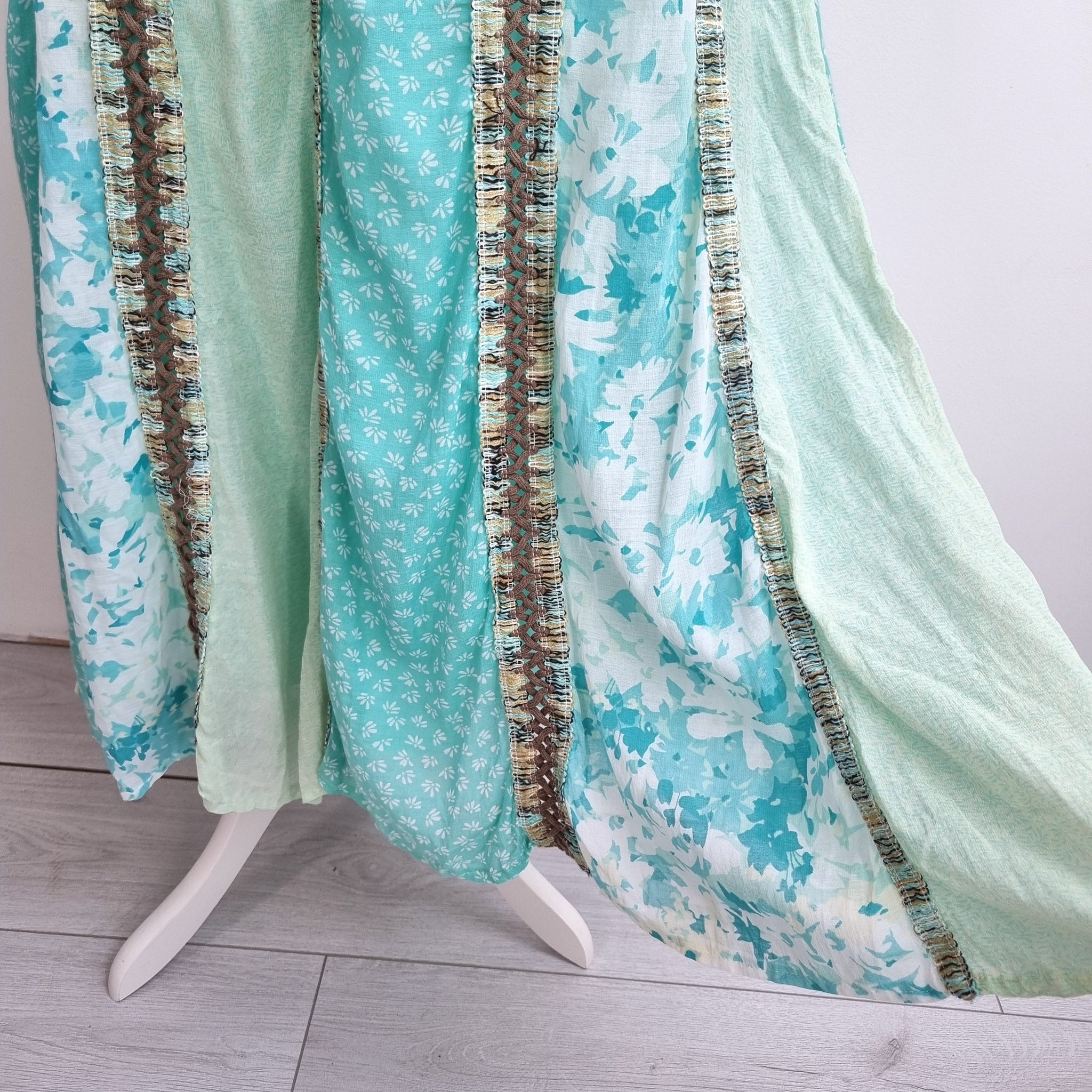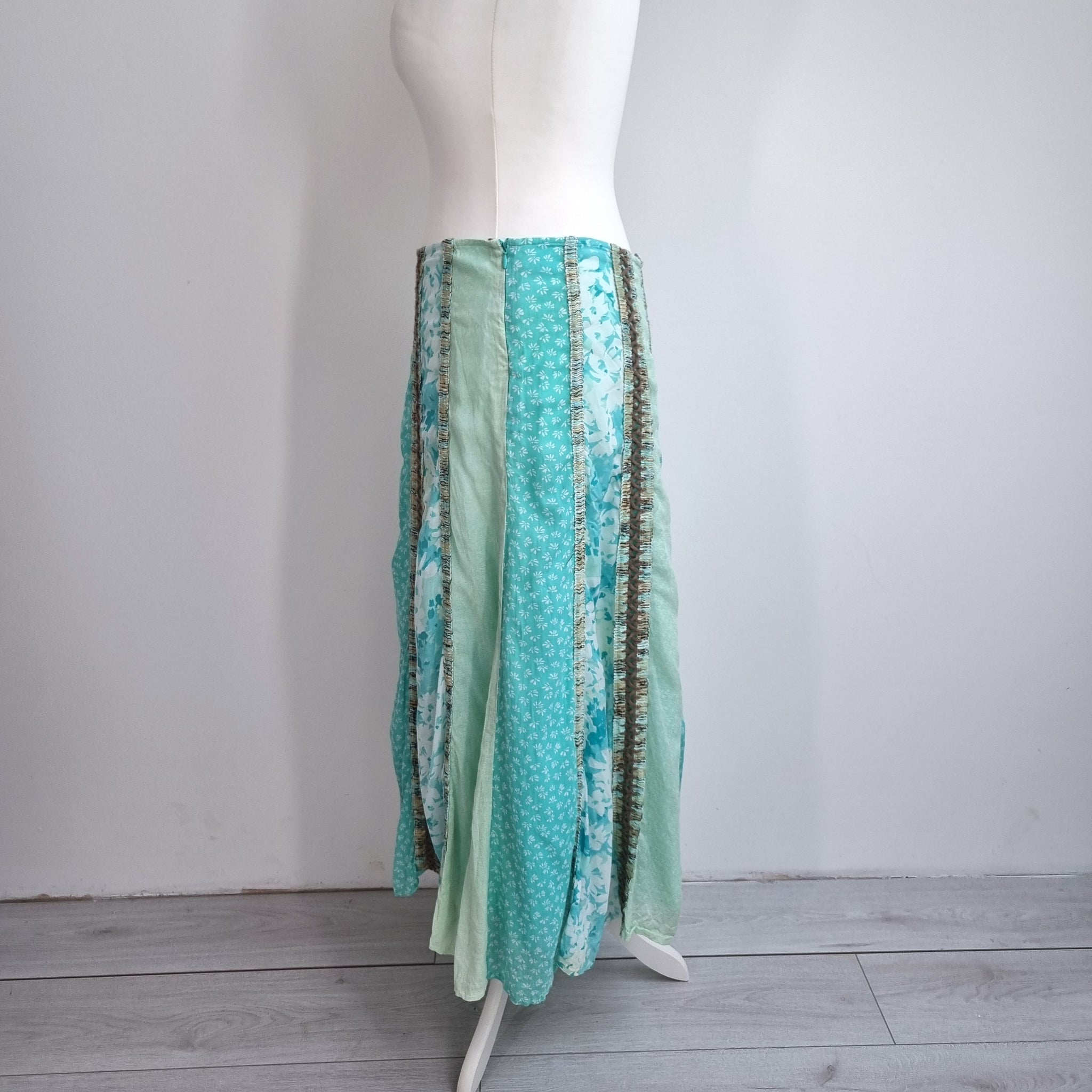 M&S Per Una Skirt - Midi - Patchwork - Floral Print - Lace Up Detail - Turquoise Blue & Mint Green - A Line - Lined - Cotton & Viscose Blend