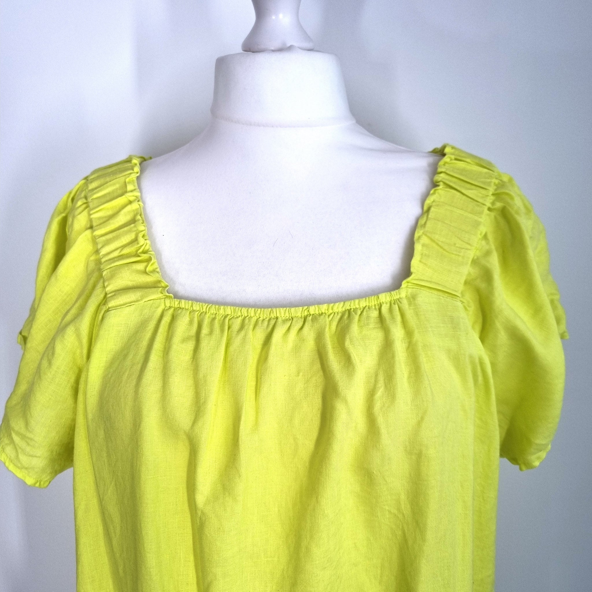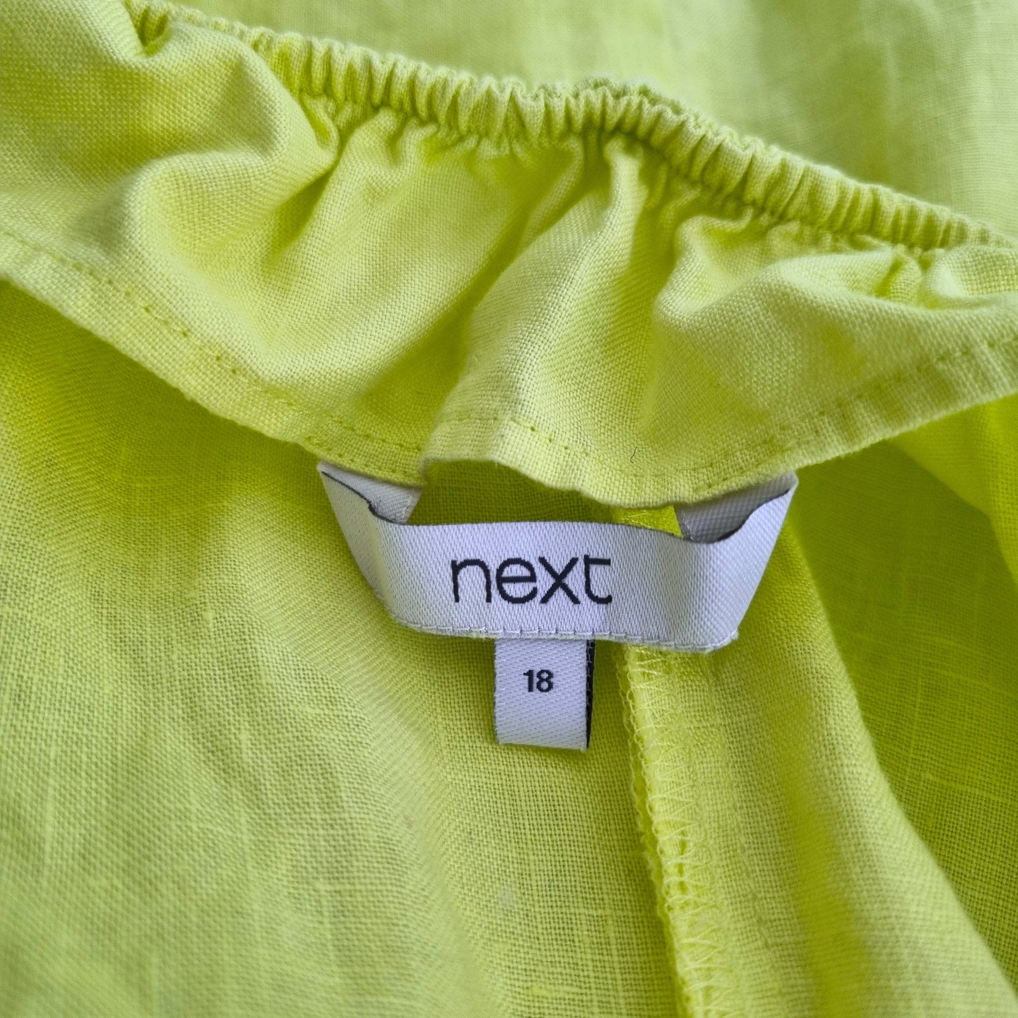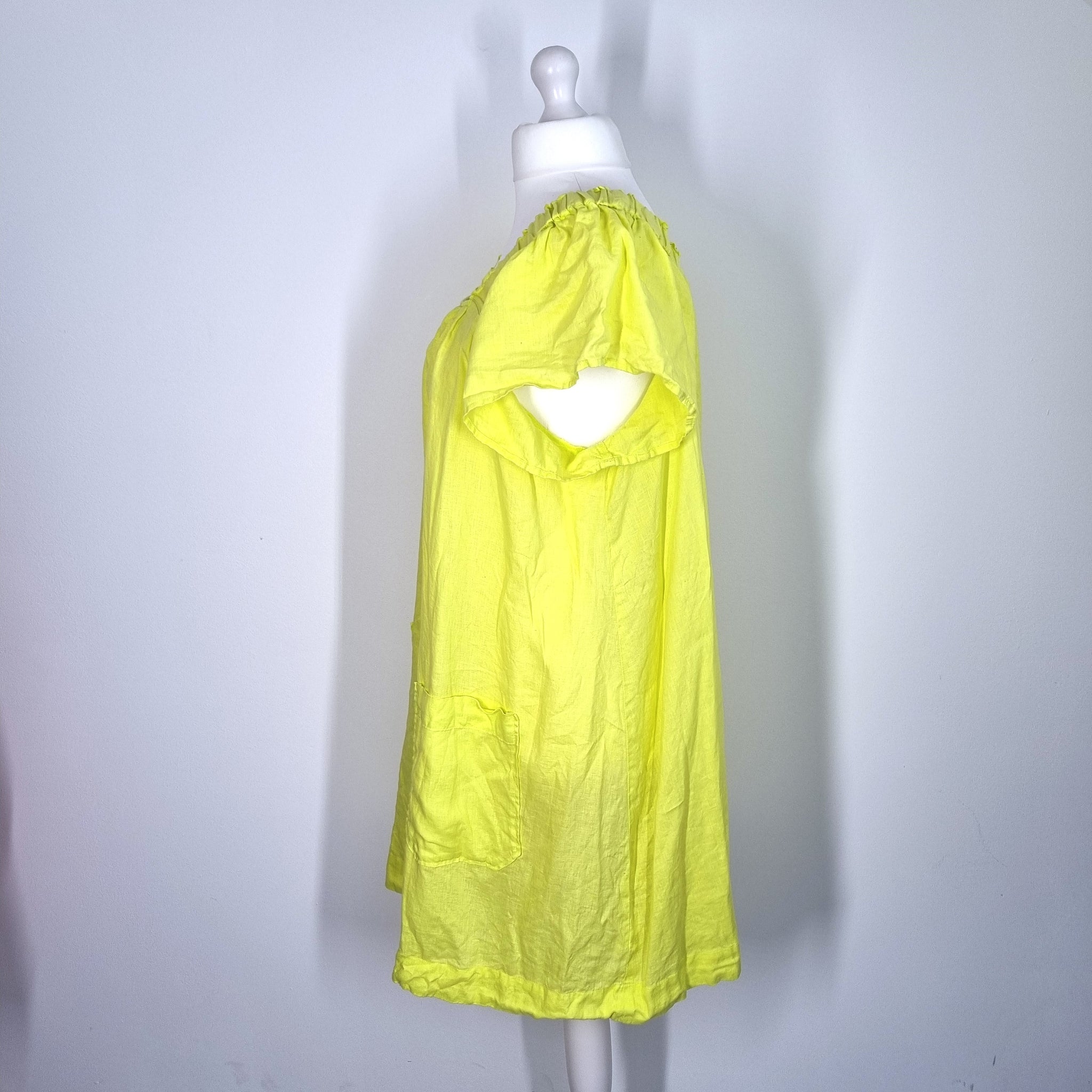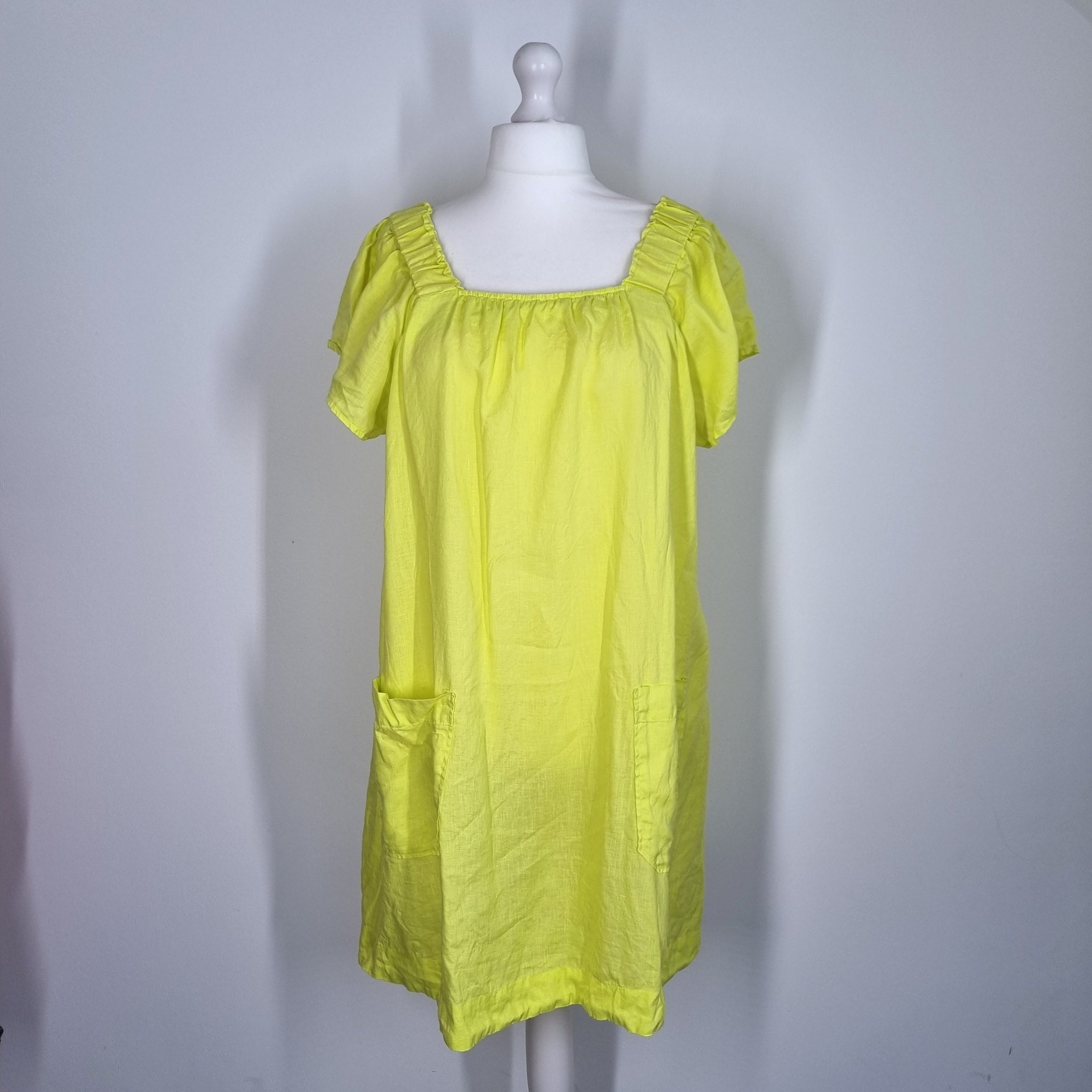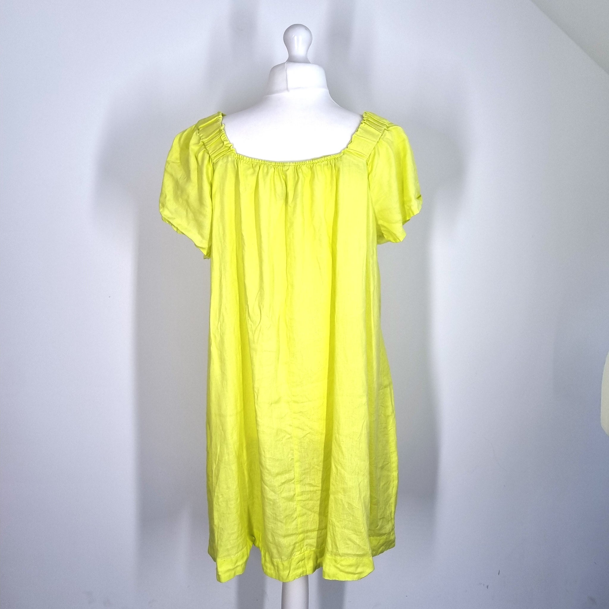Next Dress - 100% Linen - Neon Lime Yellow - Smock Style - Pockets - Short Sleeves - Elasticated Neckline - Knee Length