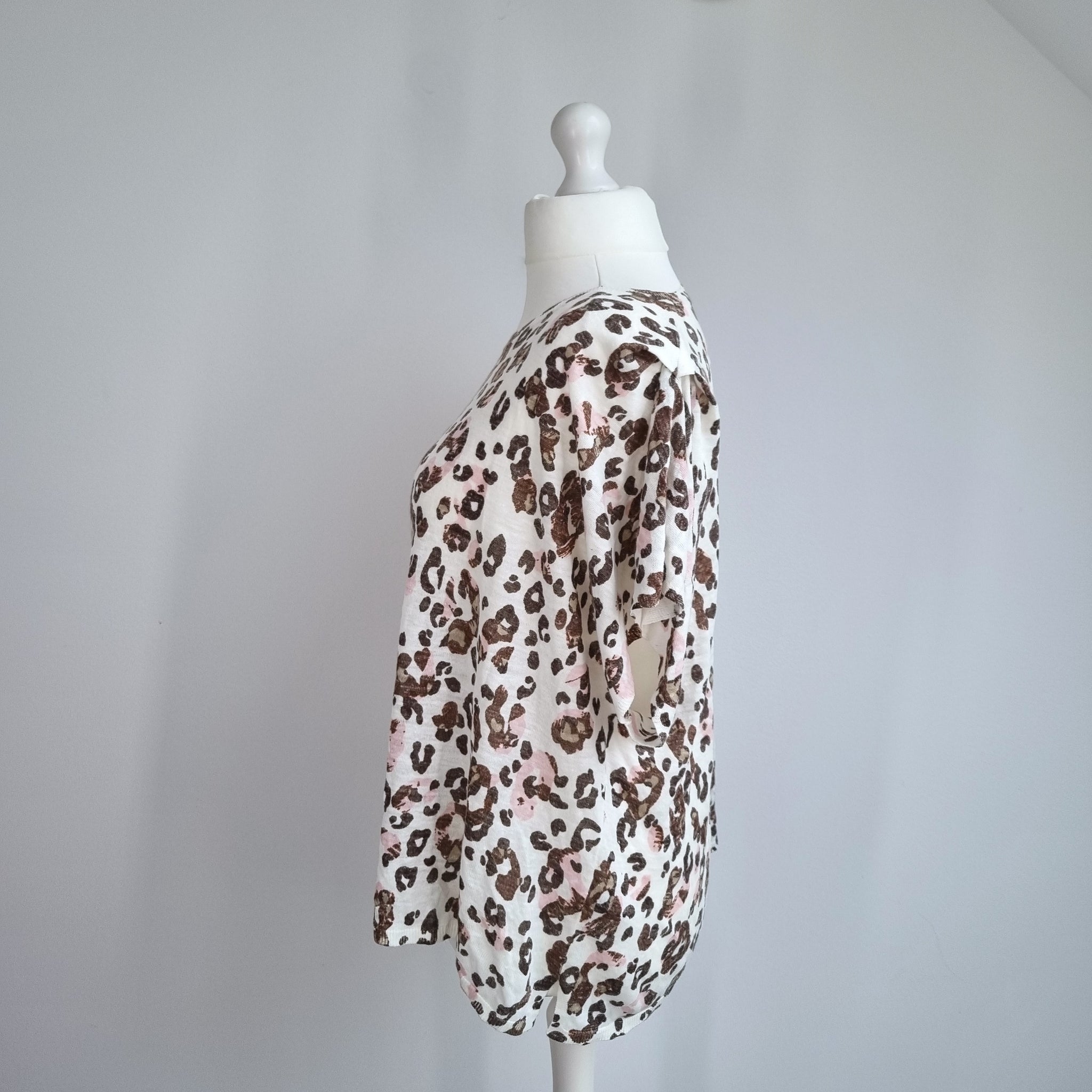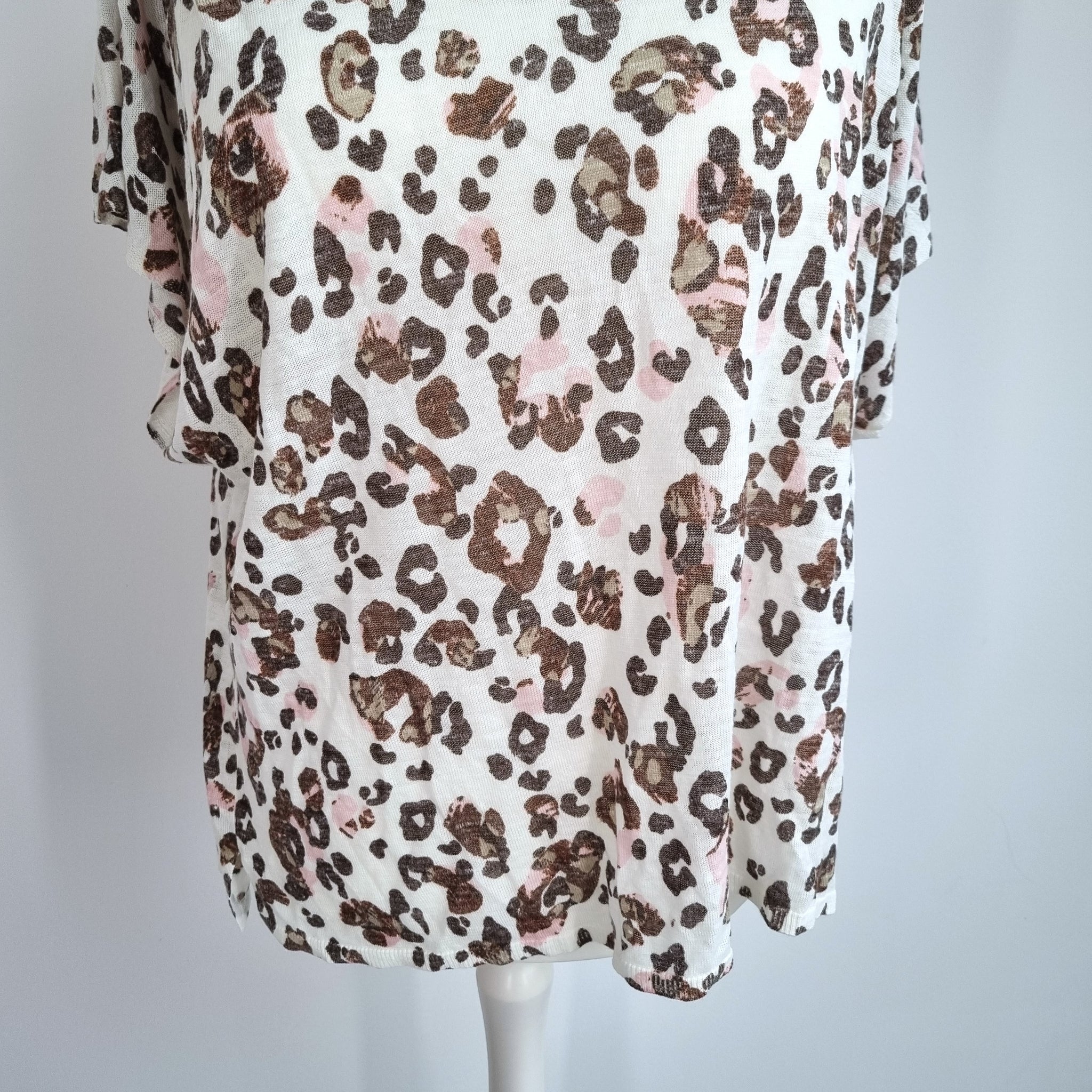 Next Knitted Blouse - Leopard Print - Acrylic (70%) & Linen (30%) Blend - Cream, Brown & Light Pink - Short Sleeve - Gathered Shoulder Detail