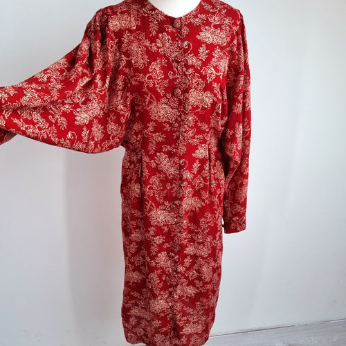 Vintage Wallis Dress Button Down Size 12 Dark Red Floral Dolman Sleeves Midi