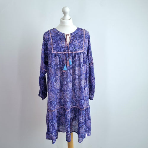 Peony Indian Smock Dress Tunic Floral One Size Purple Mini Cotton Boho Hippie