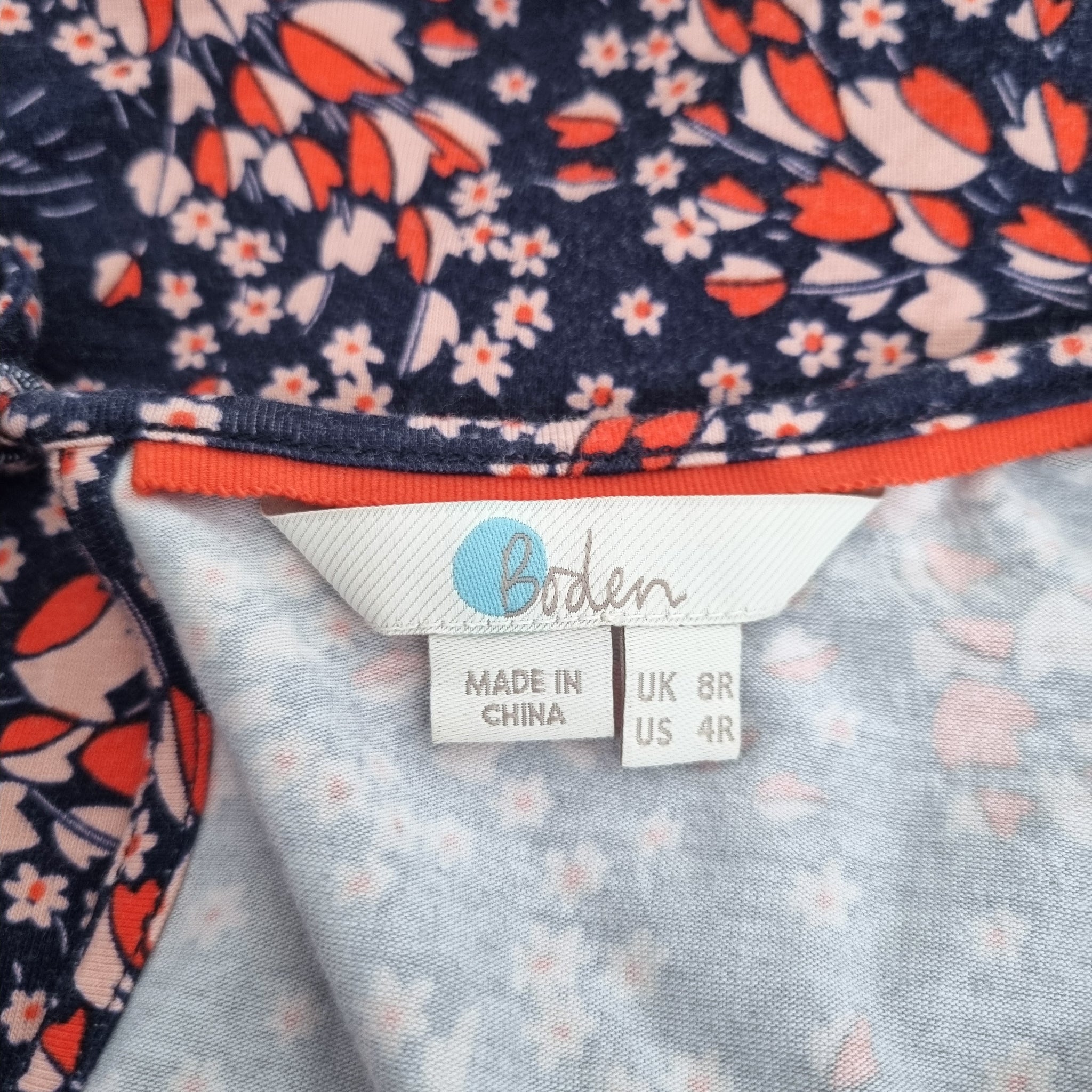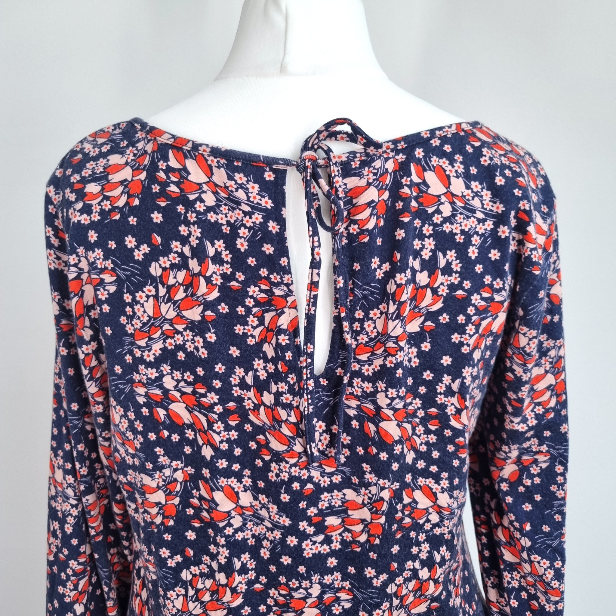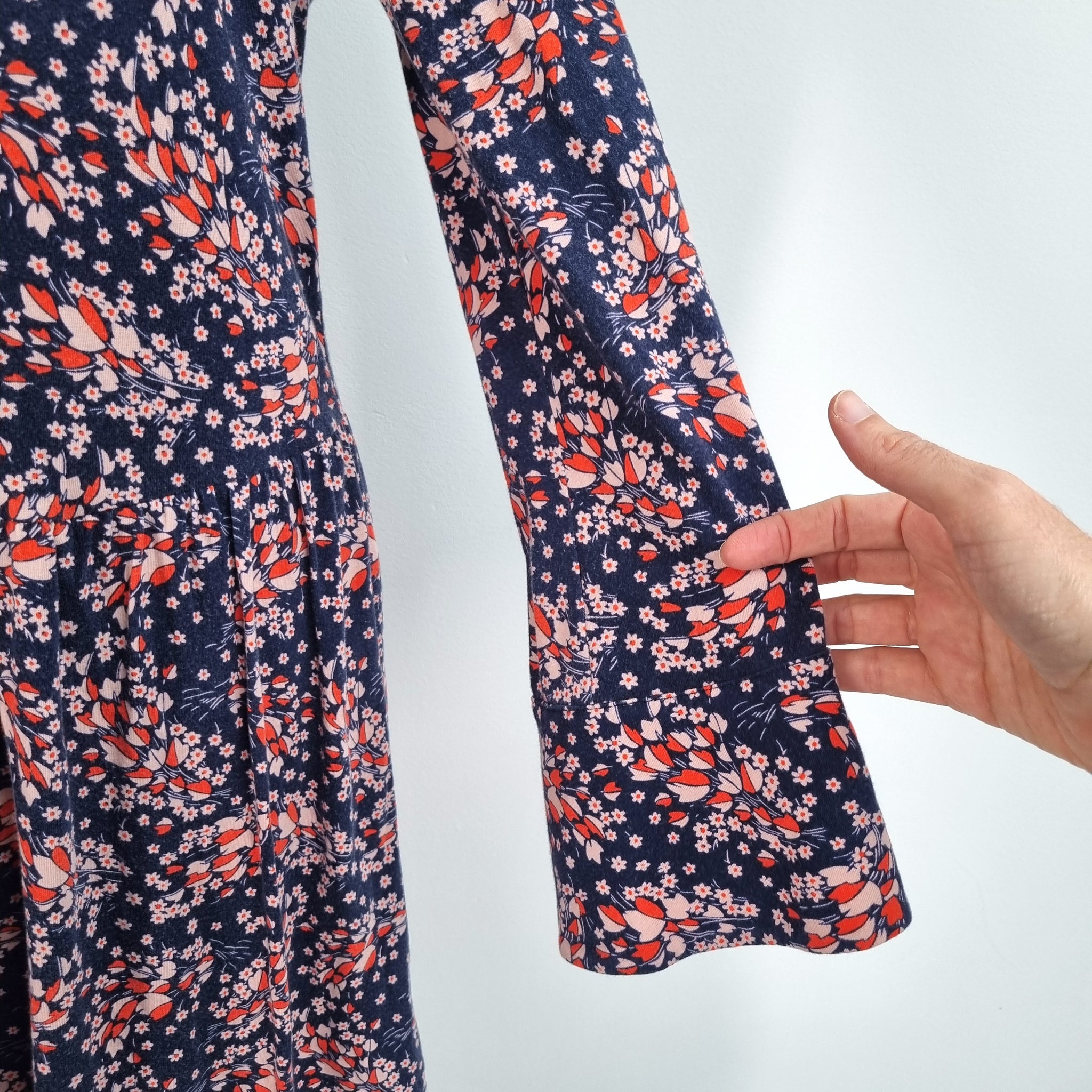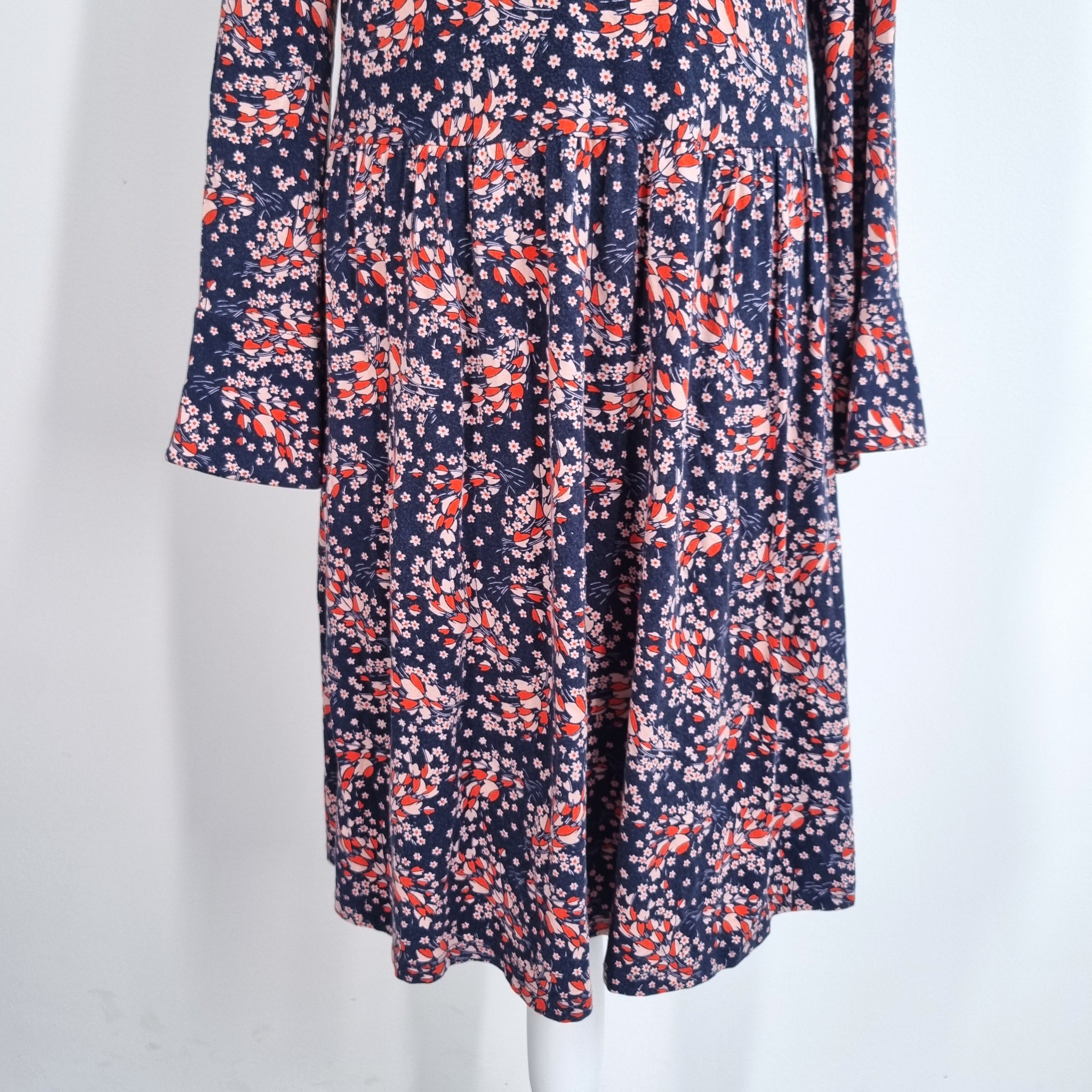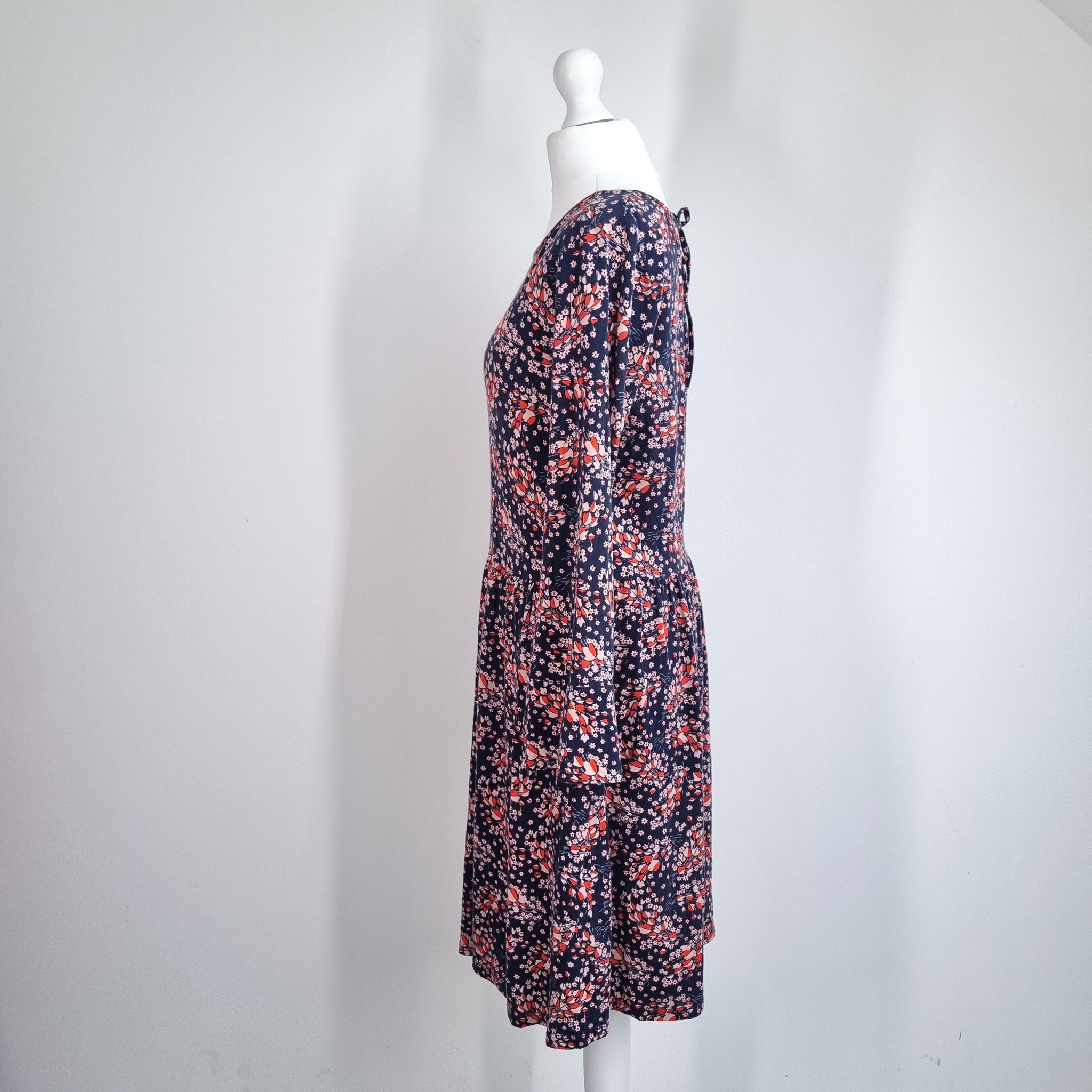 Boden Dress - Jersey - Pockets - Ditsy Floral Print - Navy Blue & Pink - Long Sleeves with Bow Detail - Stretch - Back Tie - Knee Length - Drop Waist