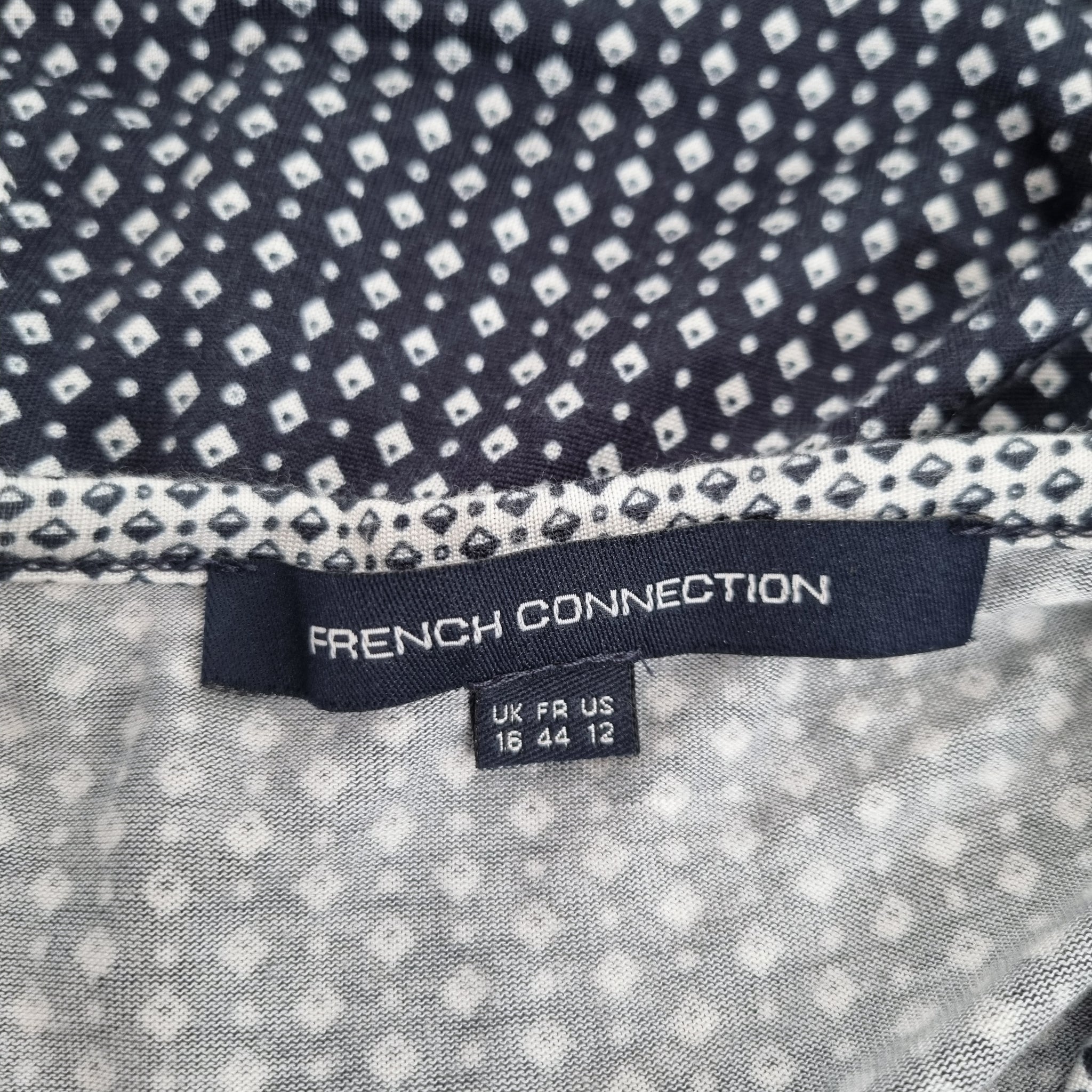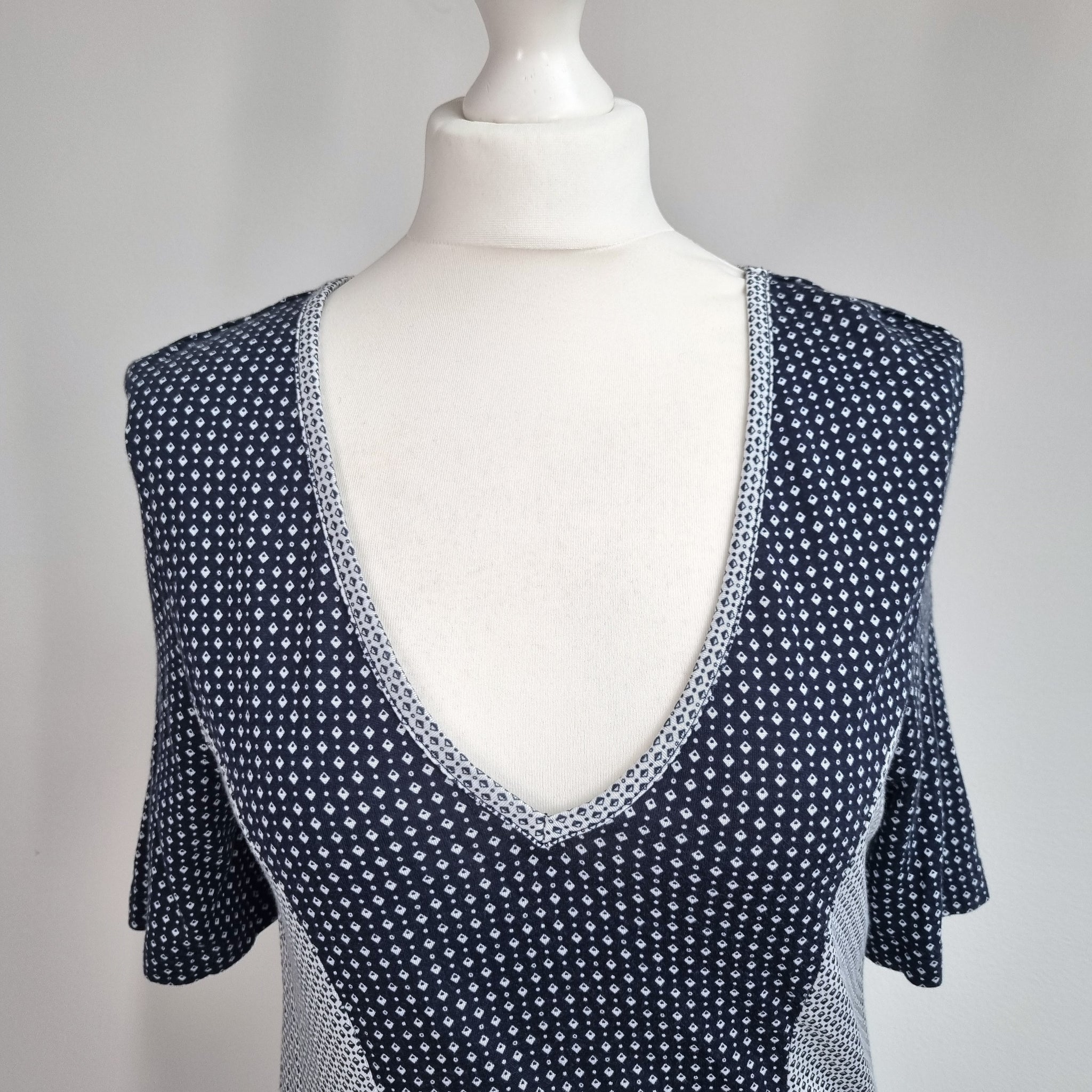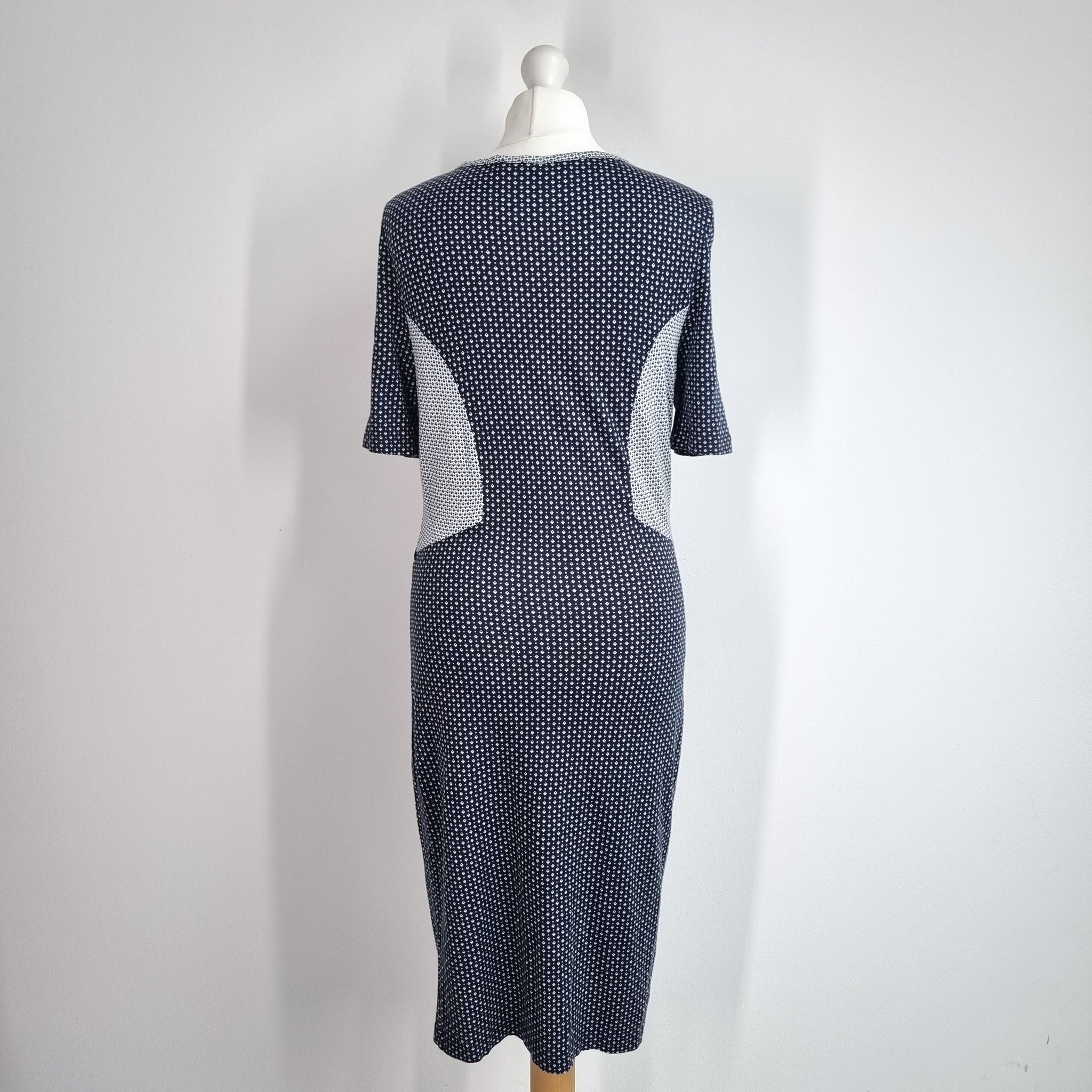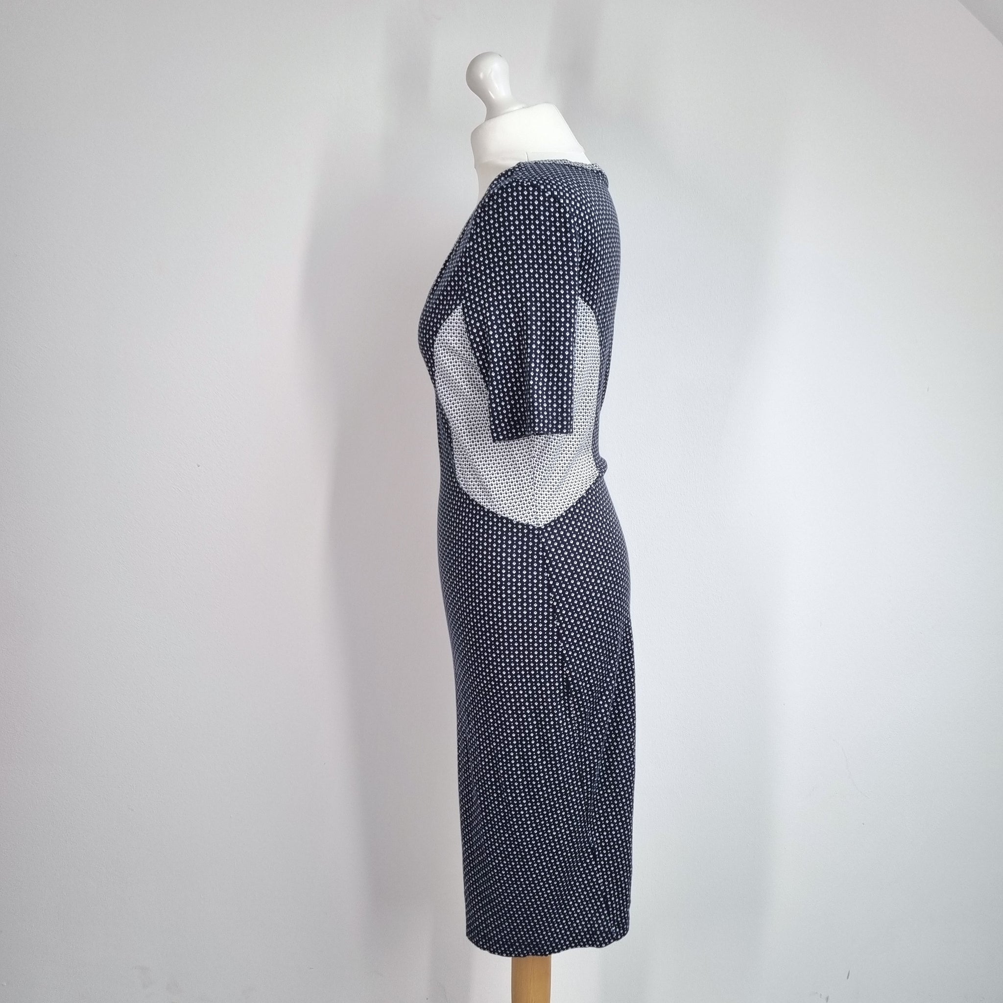 French Connection Wiggle Dress - Fitted - Navy Blue & White - Ditsy Geometric Print - Short Sleeves - Knee Length - Low V Neck