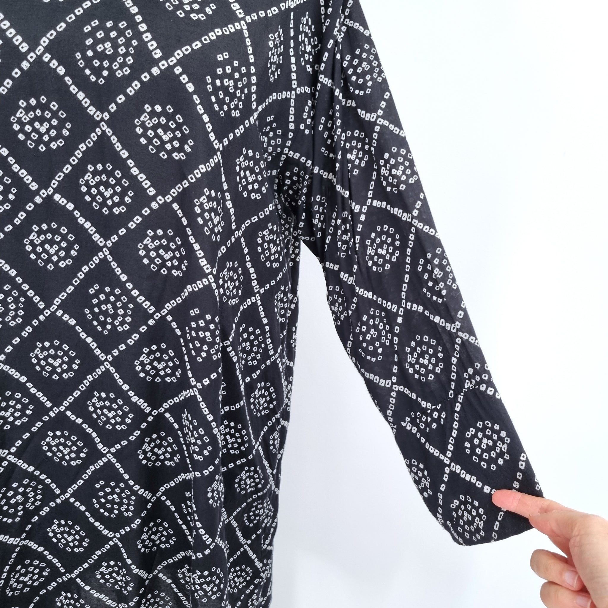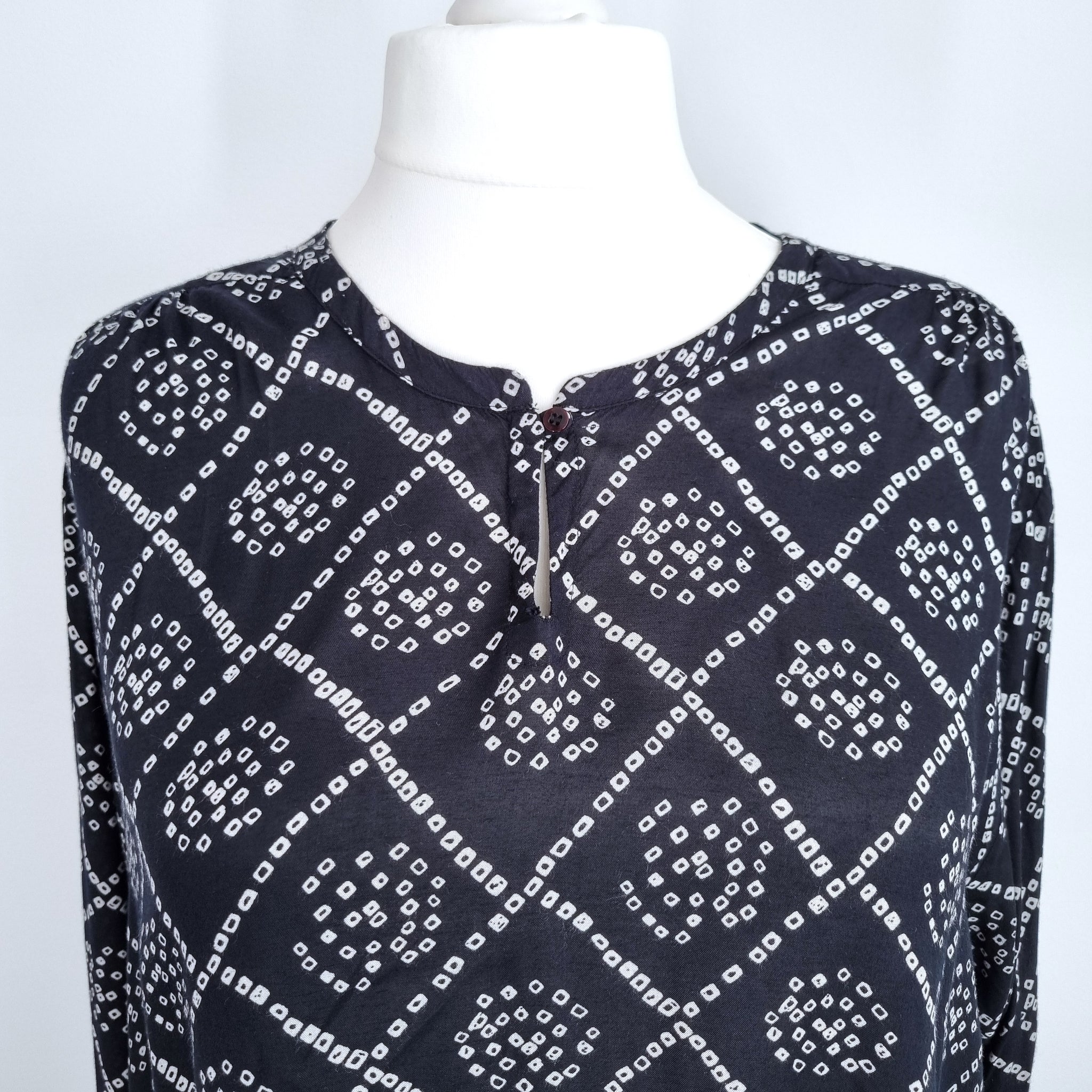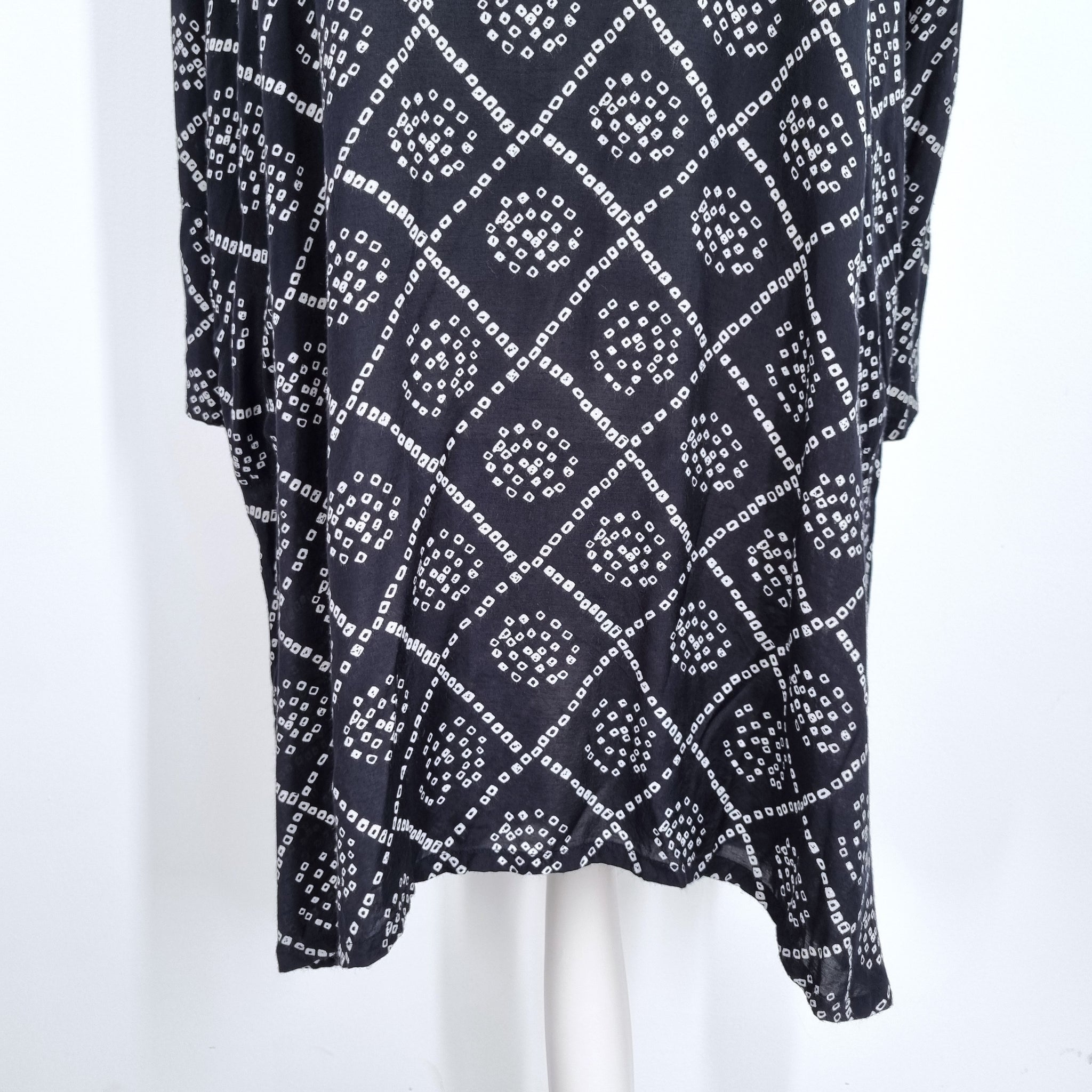 Masai Tunic Dress - Pockets - High Low Hem - Knee Length / Midi - Black & White - Long Sleeves - Geometric Print - Neckline Button Detail - 100% Viscose