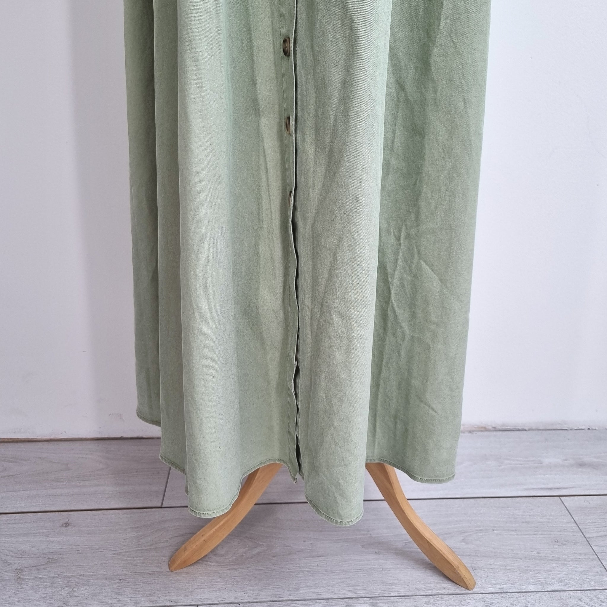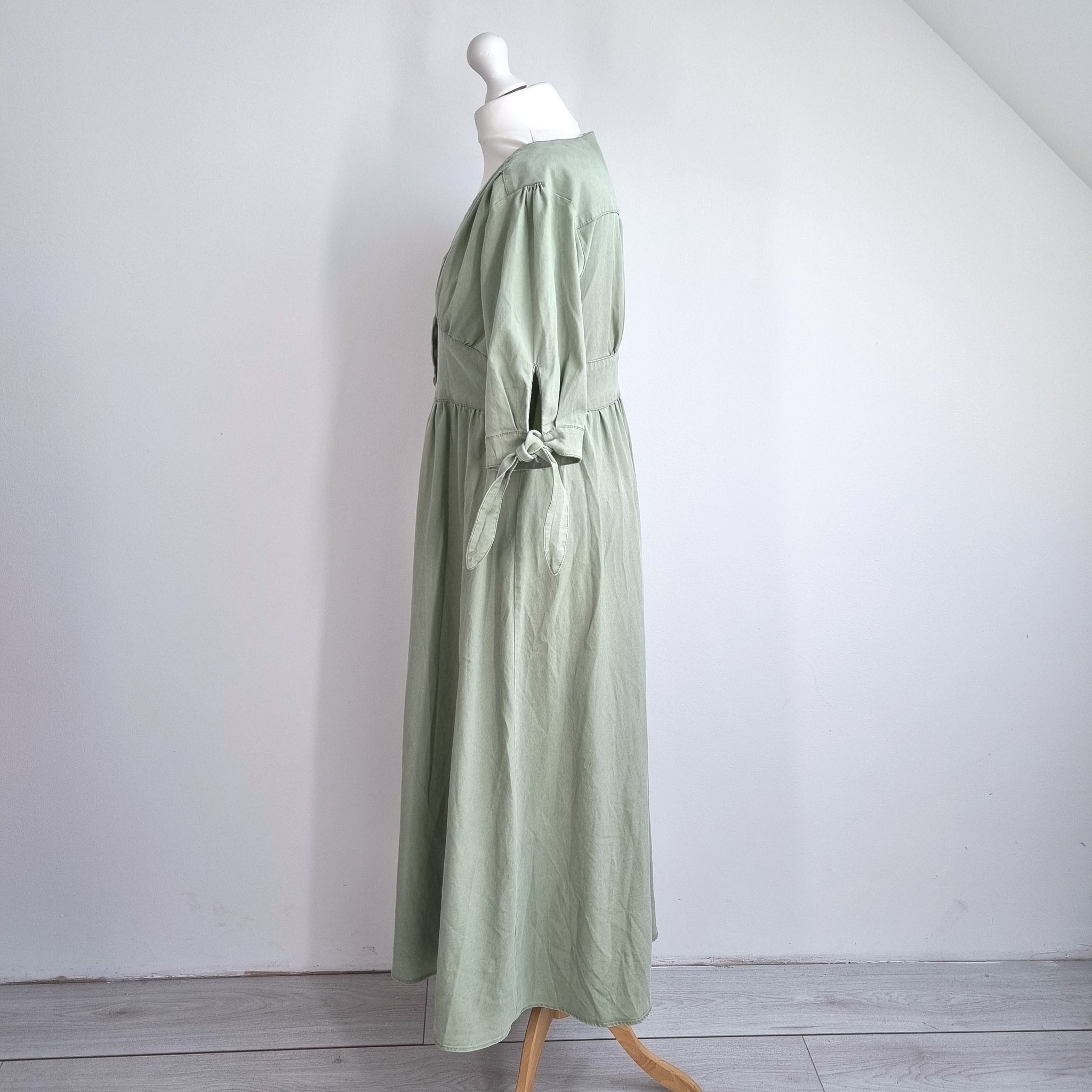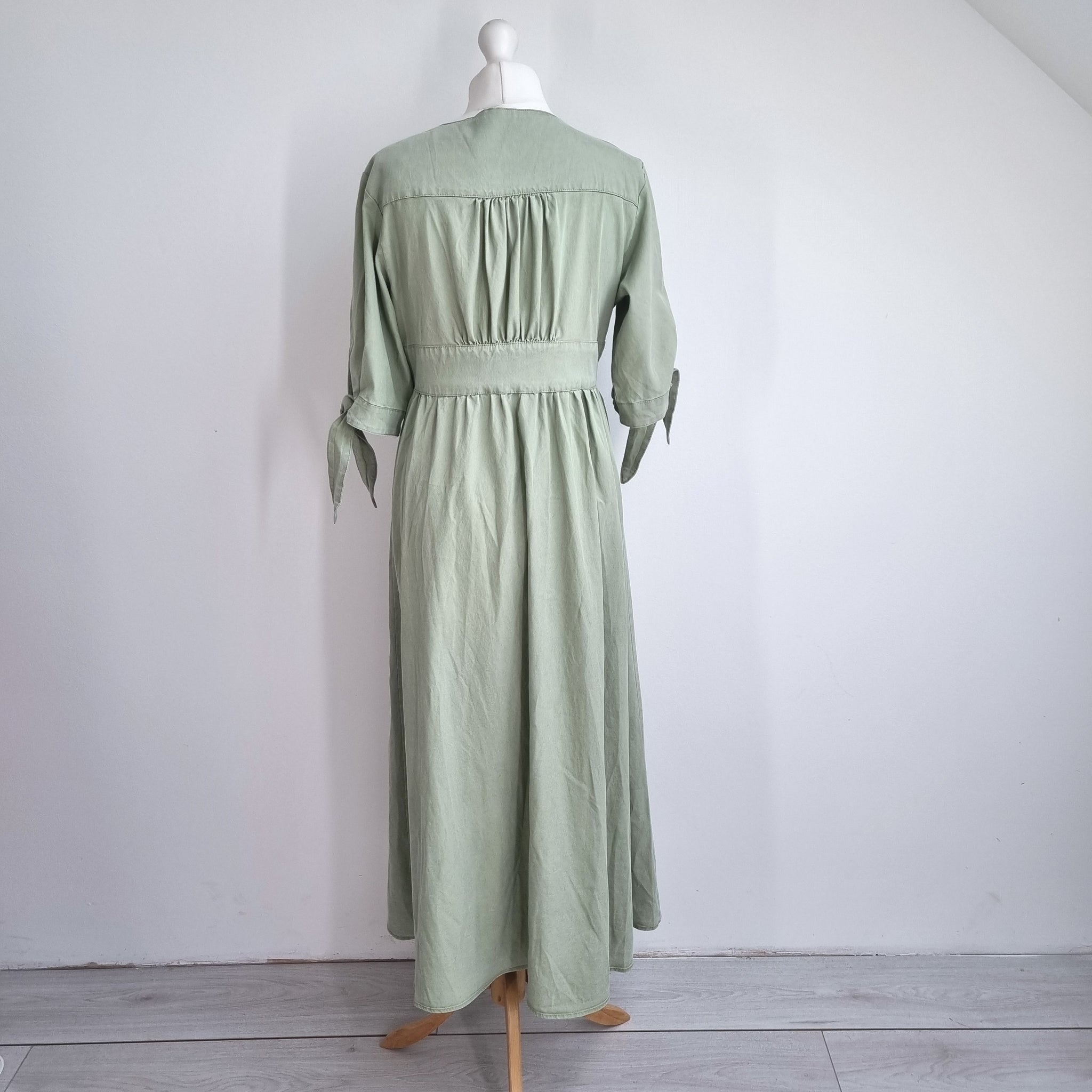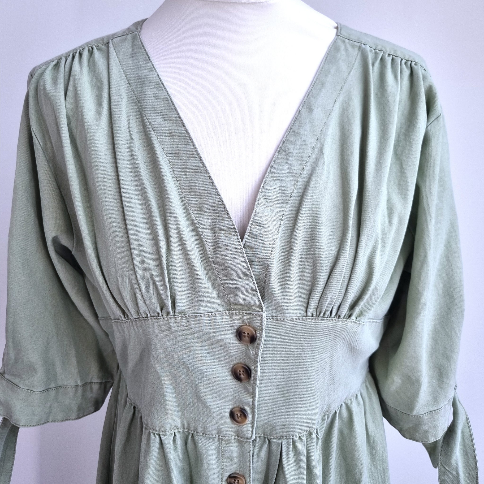 Midi Tea Dress - Button Down - Sage Green - 100% Cotton - Tie Sleeve - Gathered Back
