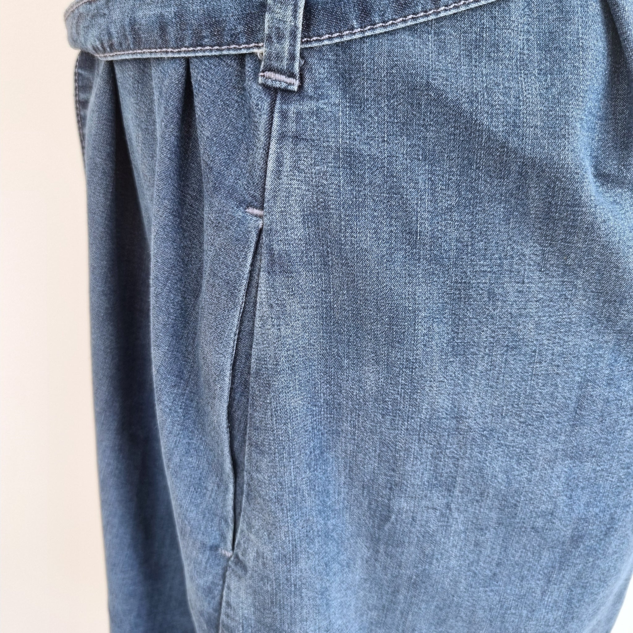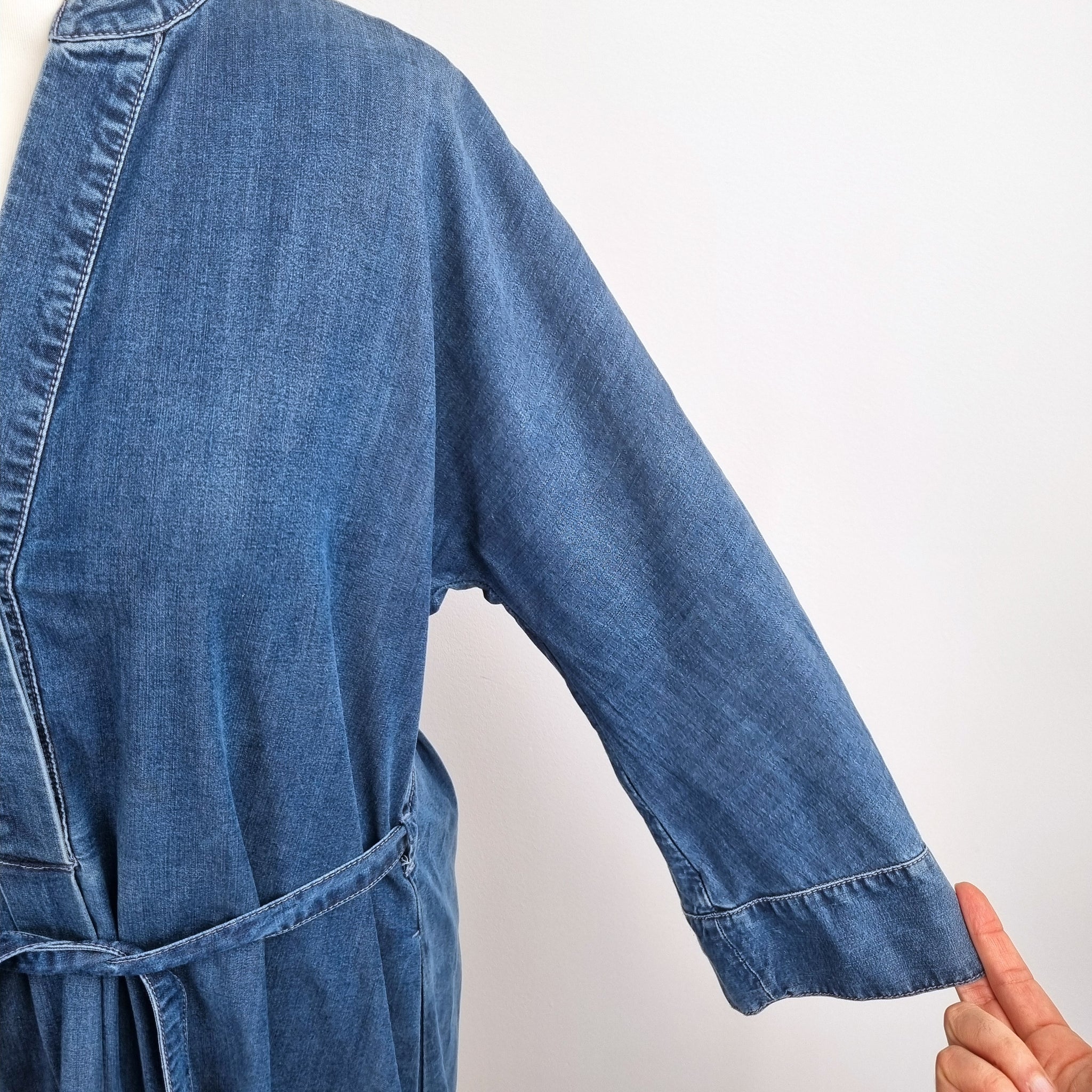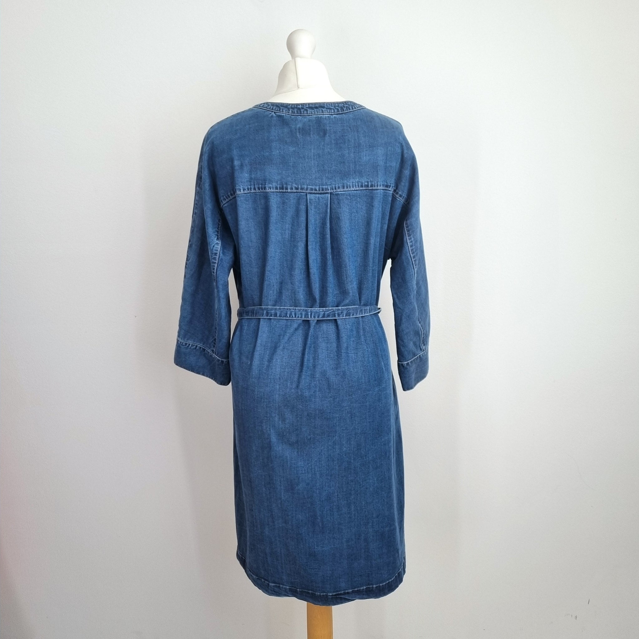 The White Company 'White Label' Denim Dress - Belted - Pockets - Blue - Stretch - Long Sleeves - V Neck with Buttons - Knee Length - A Line - Lyocell Blend