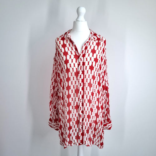 Zara Oversized Chiffon Shirt XS S Red White Polka Dot Tunic Blouse Retro Print
