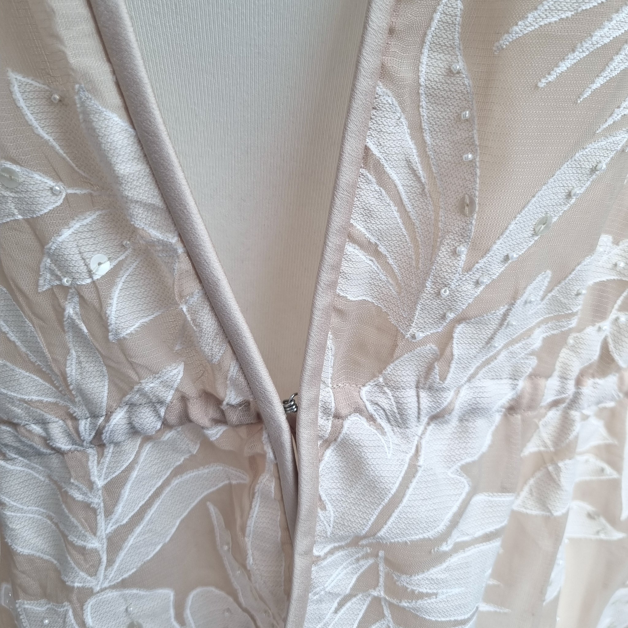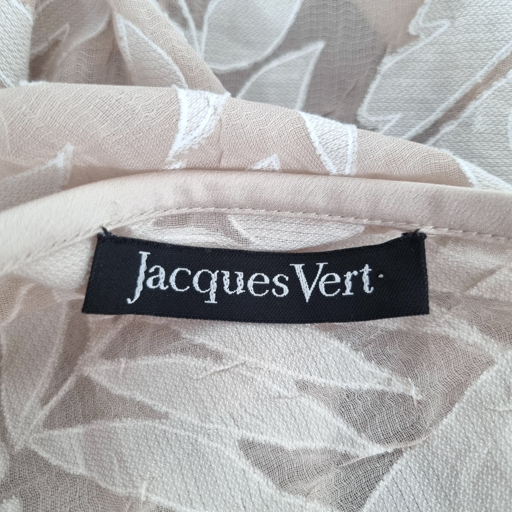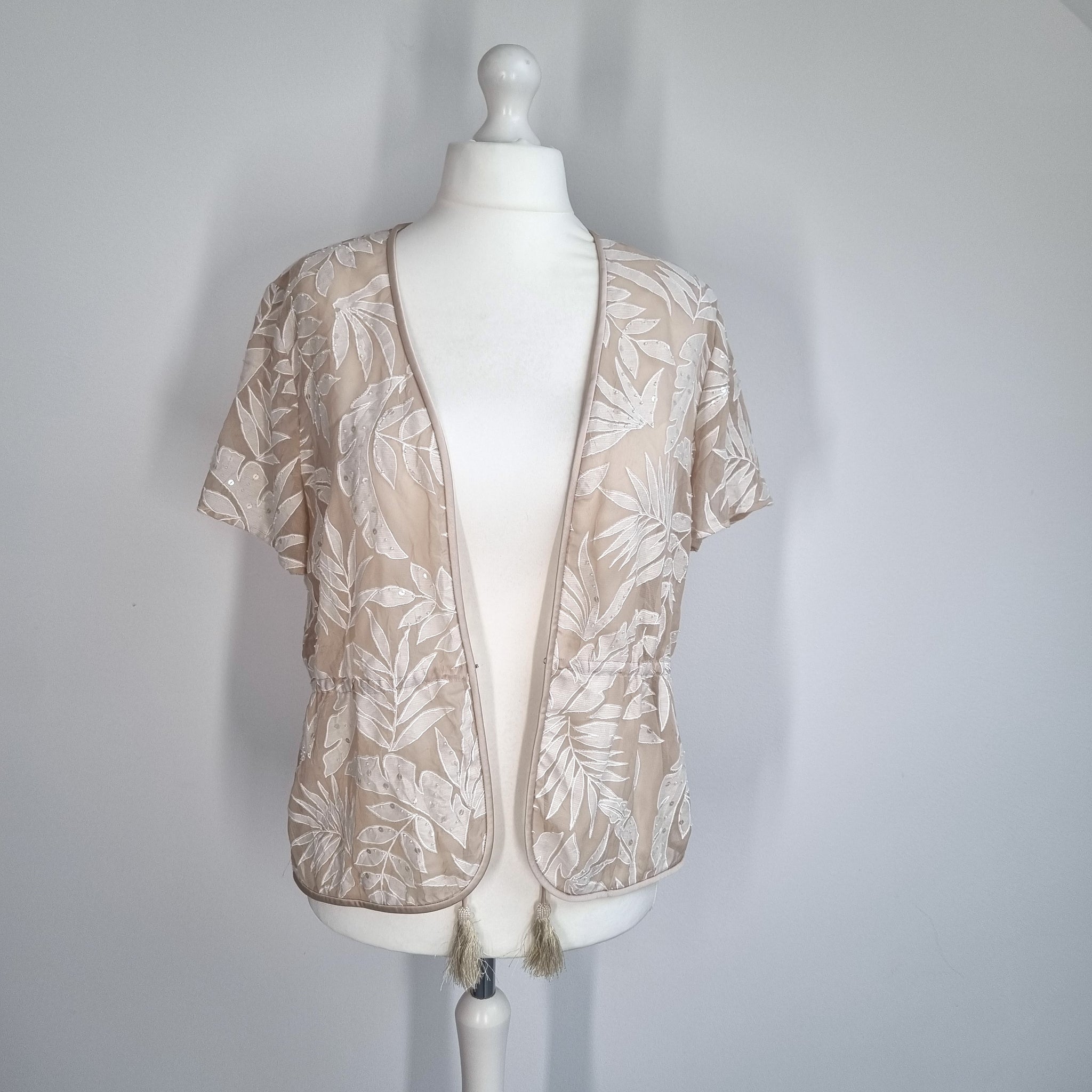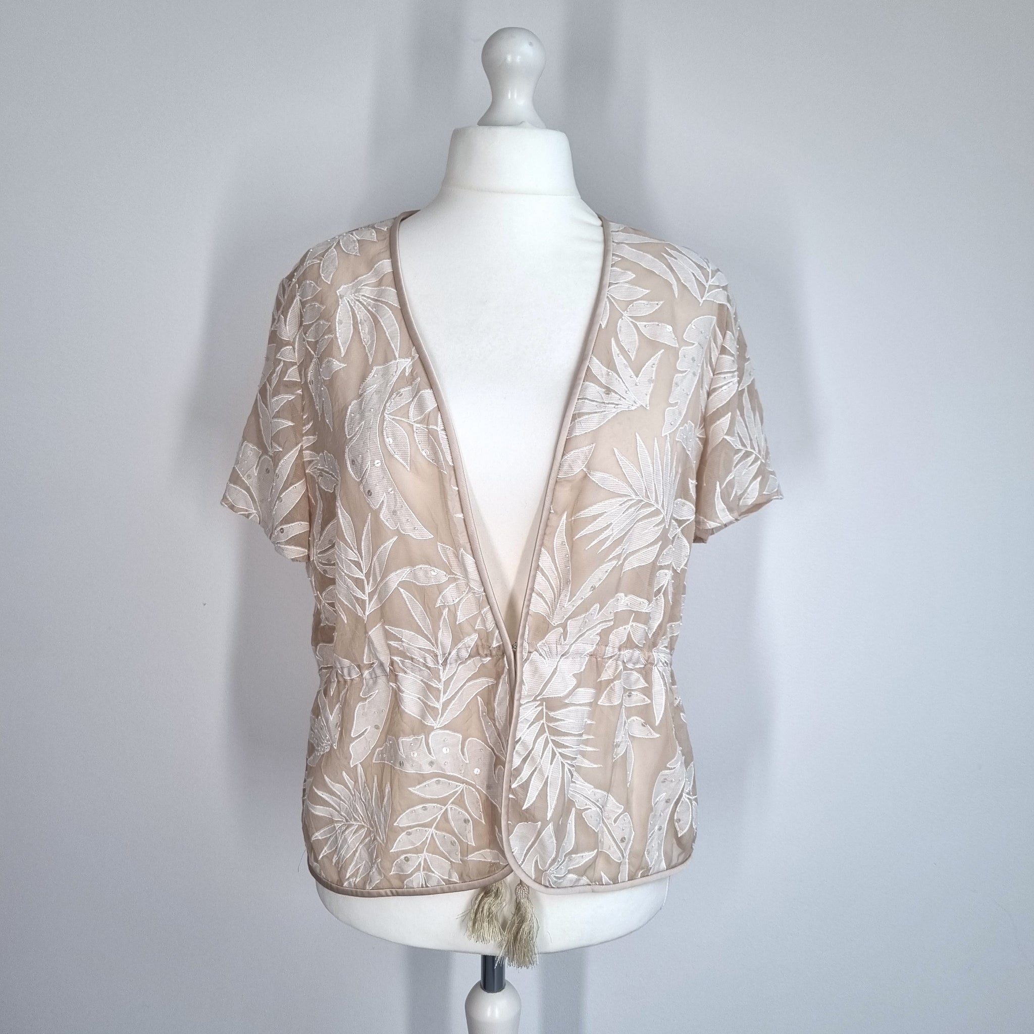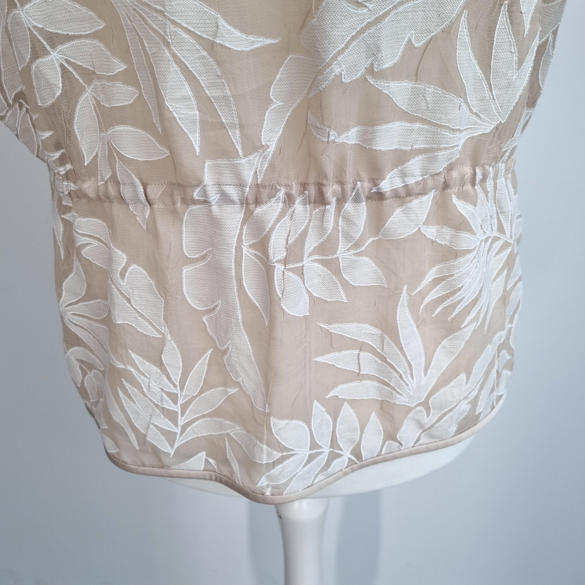 Jacques Vert Open Blouse - Cream - Devore Style Leaf Pattern - V Neck - Sheer - Hook & Eye Fastening - Drawstring with Tassels - Short Sleeves