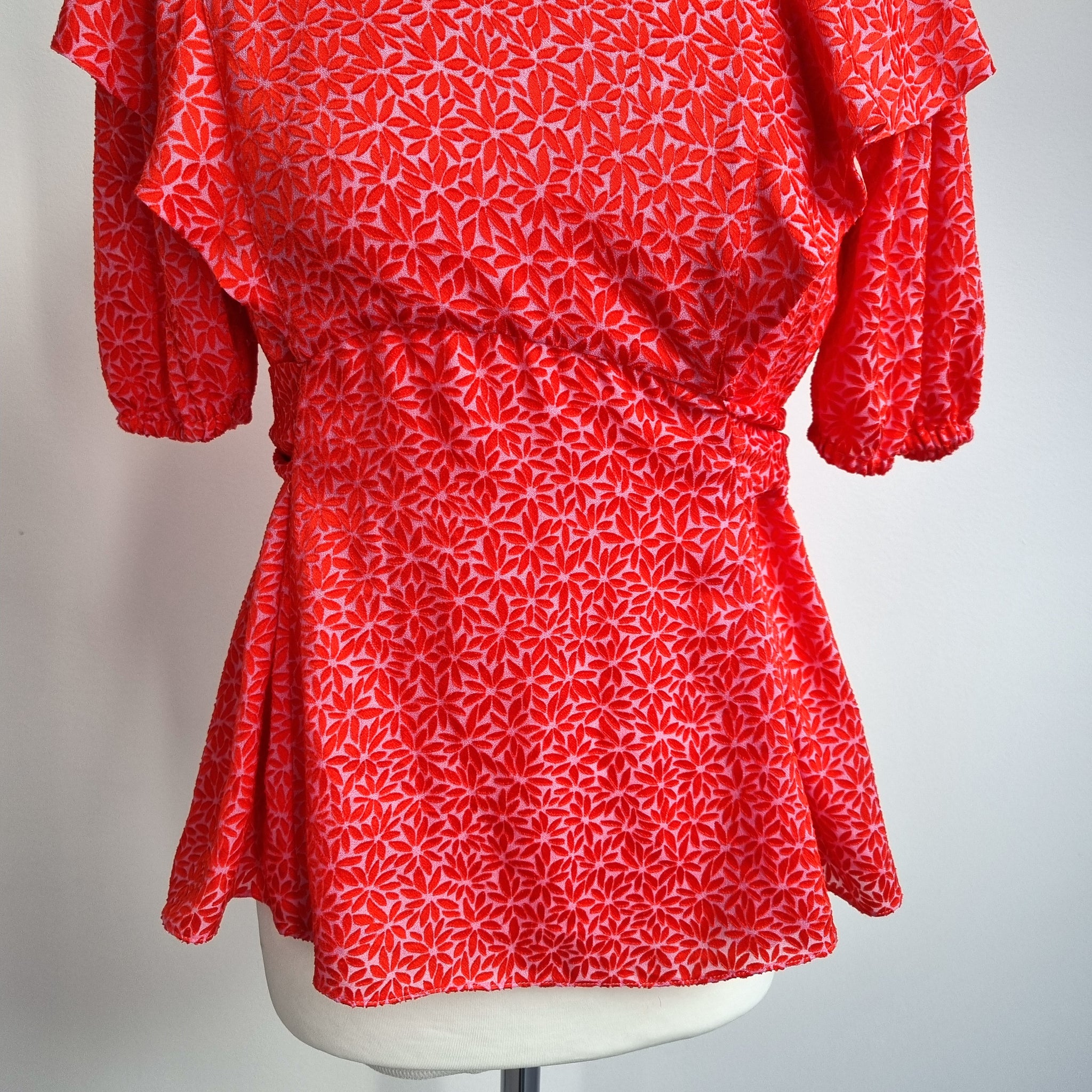 Ted Baker Top - Devore Jacquard Fabric - Ruffle Detail - Coral Red - Puff Sleeves- Back Ties - Floral Pattern - Lined (bust) - Short Sleeves