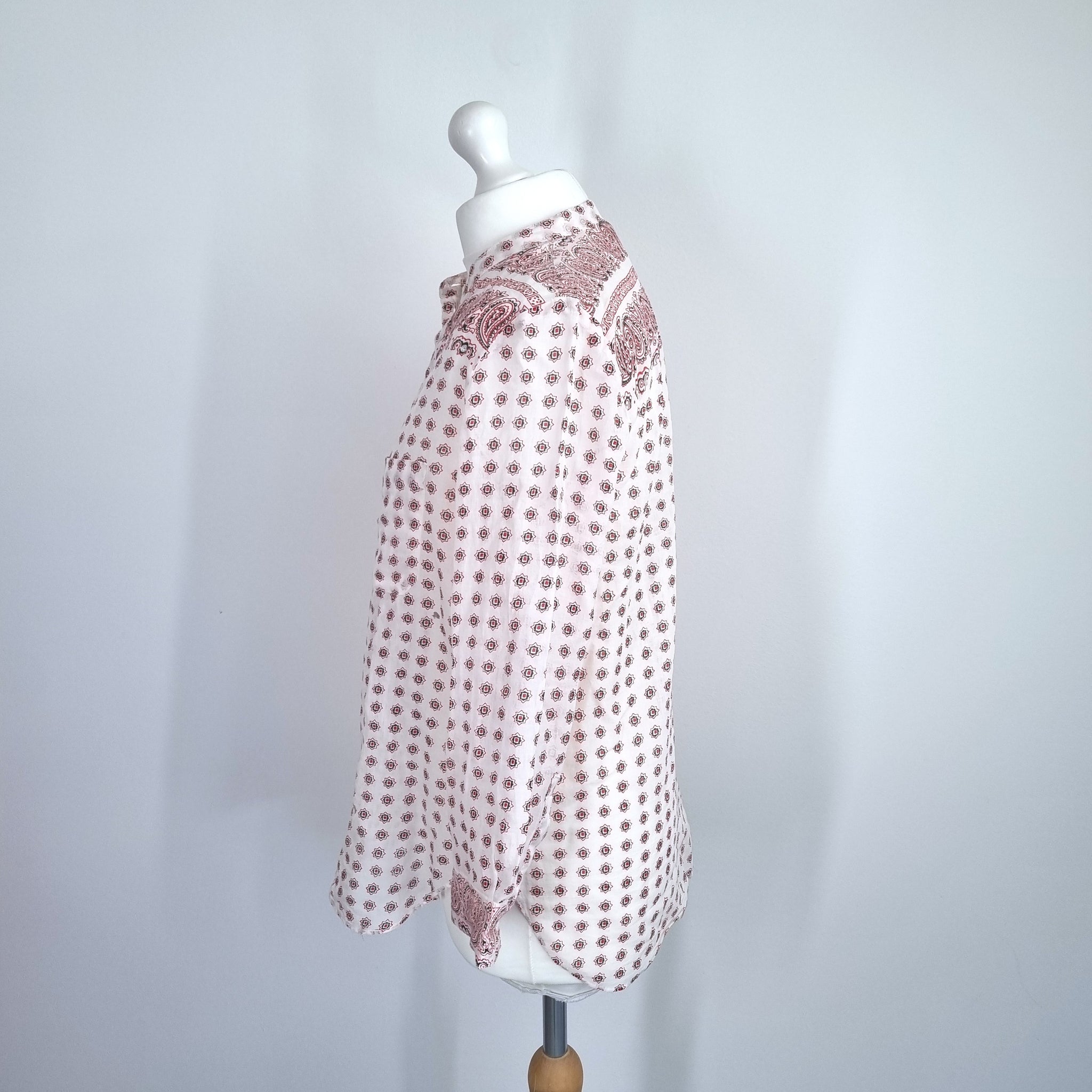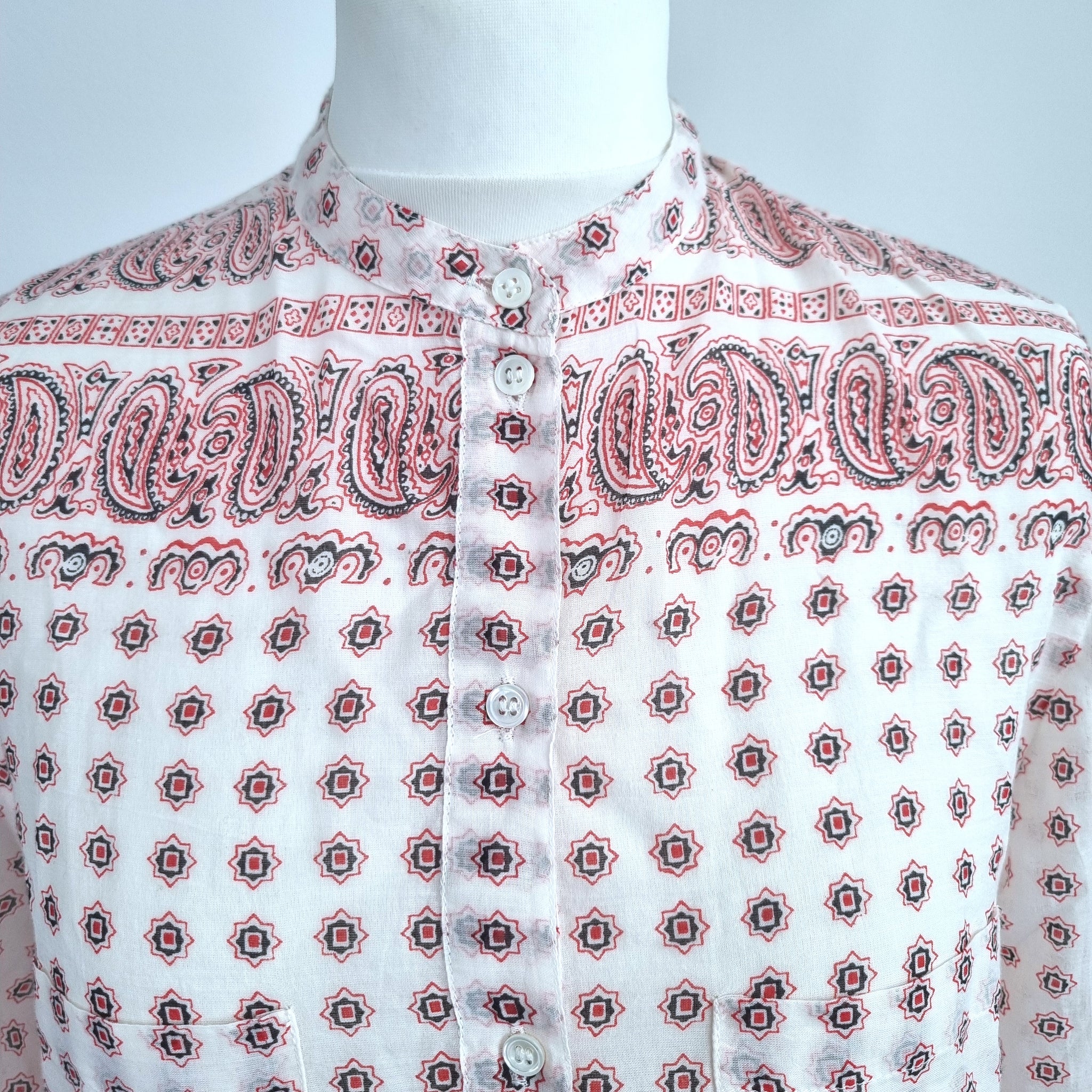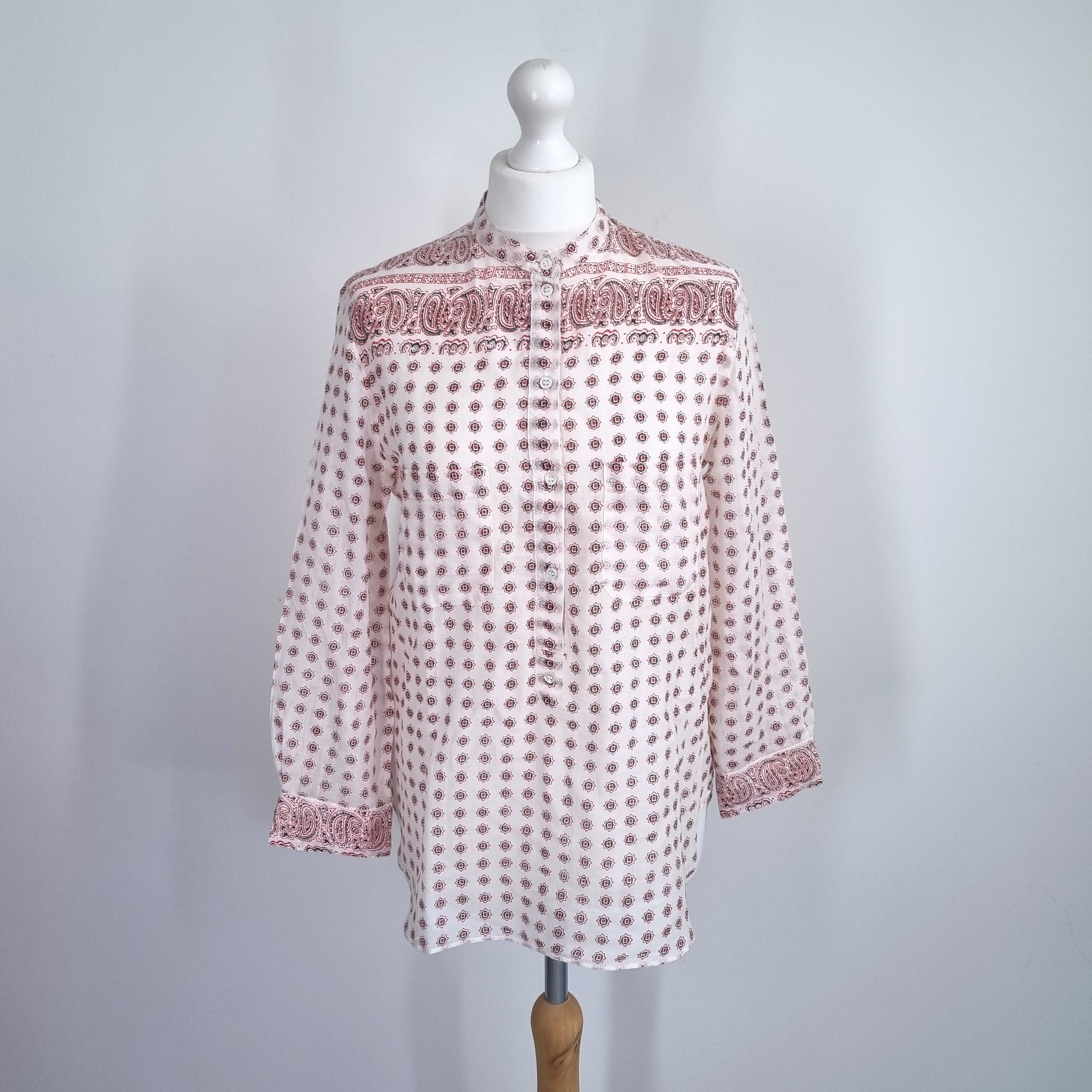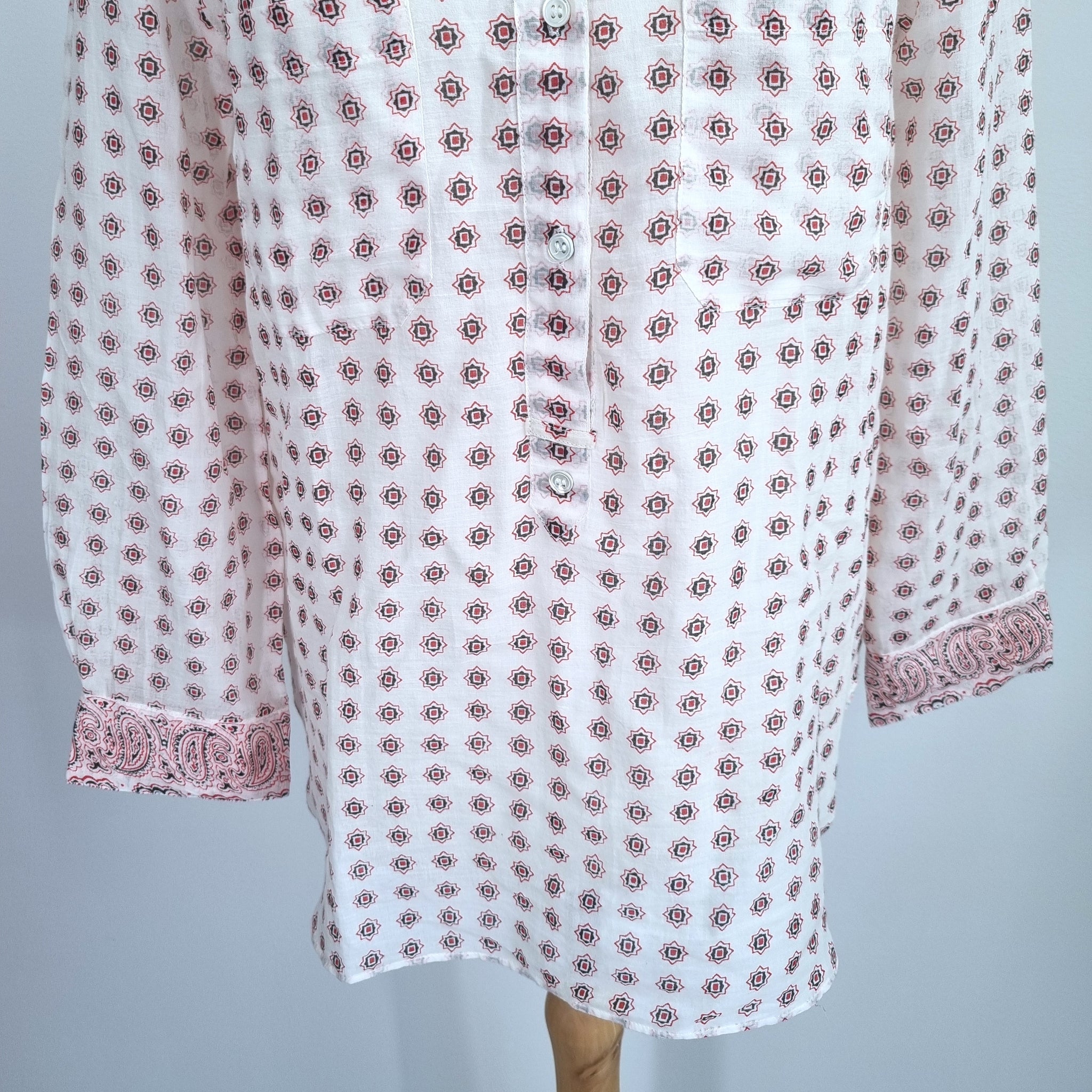 Vanessa Bruno Tunic Blouse - Paisley Print - 100% Cotton - Cream & Red - Mock Neck - 1/2 Buttons - Long Sleeves