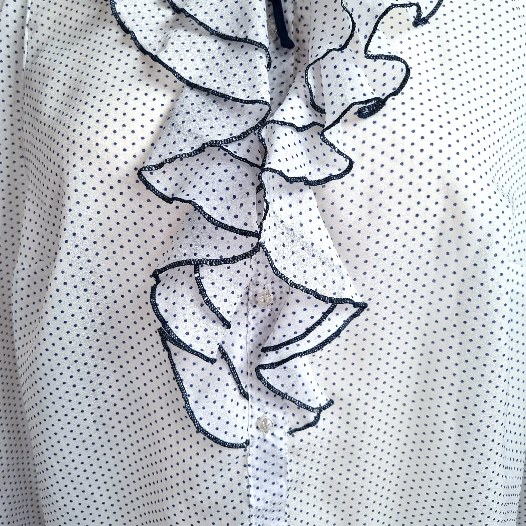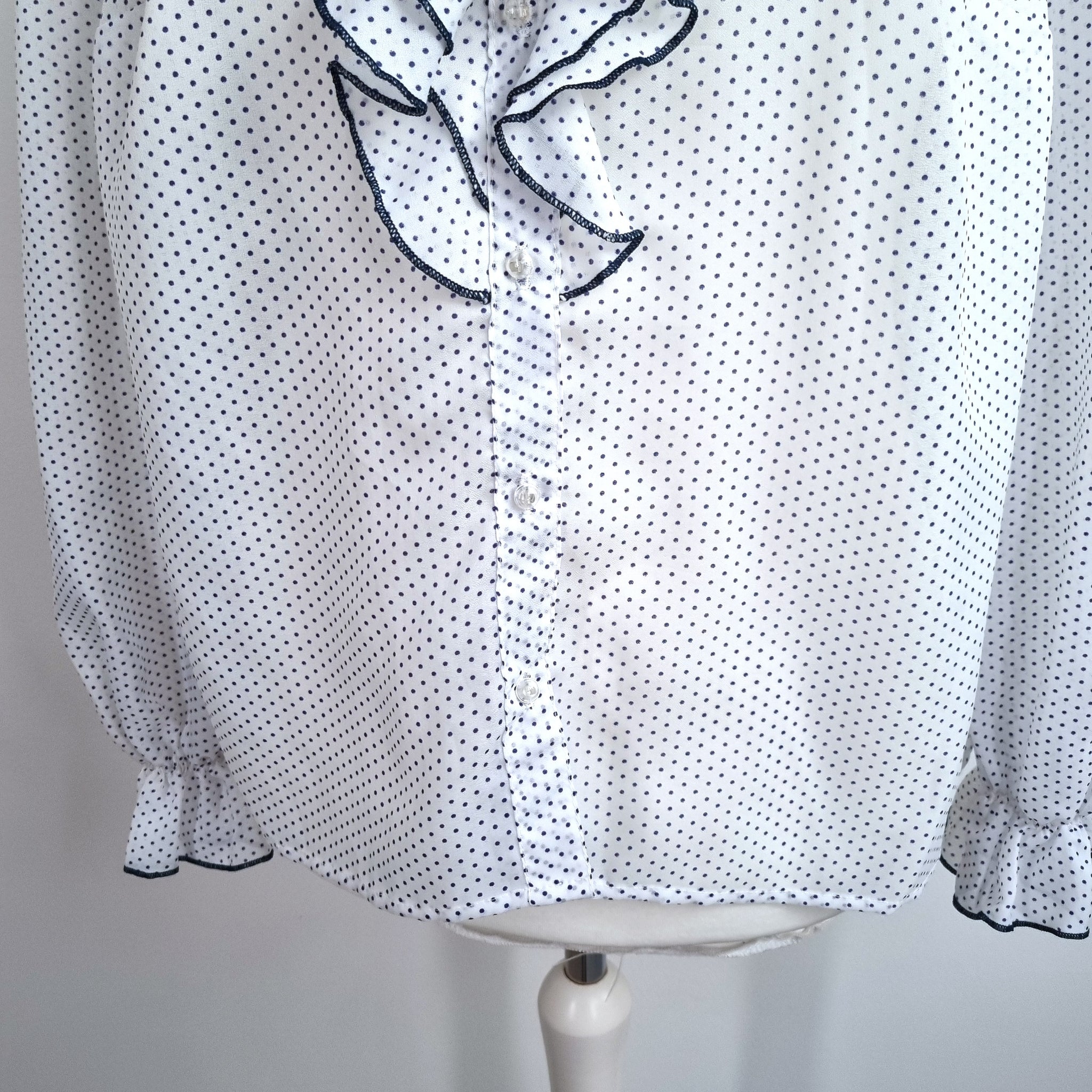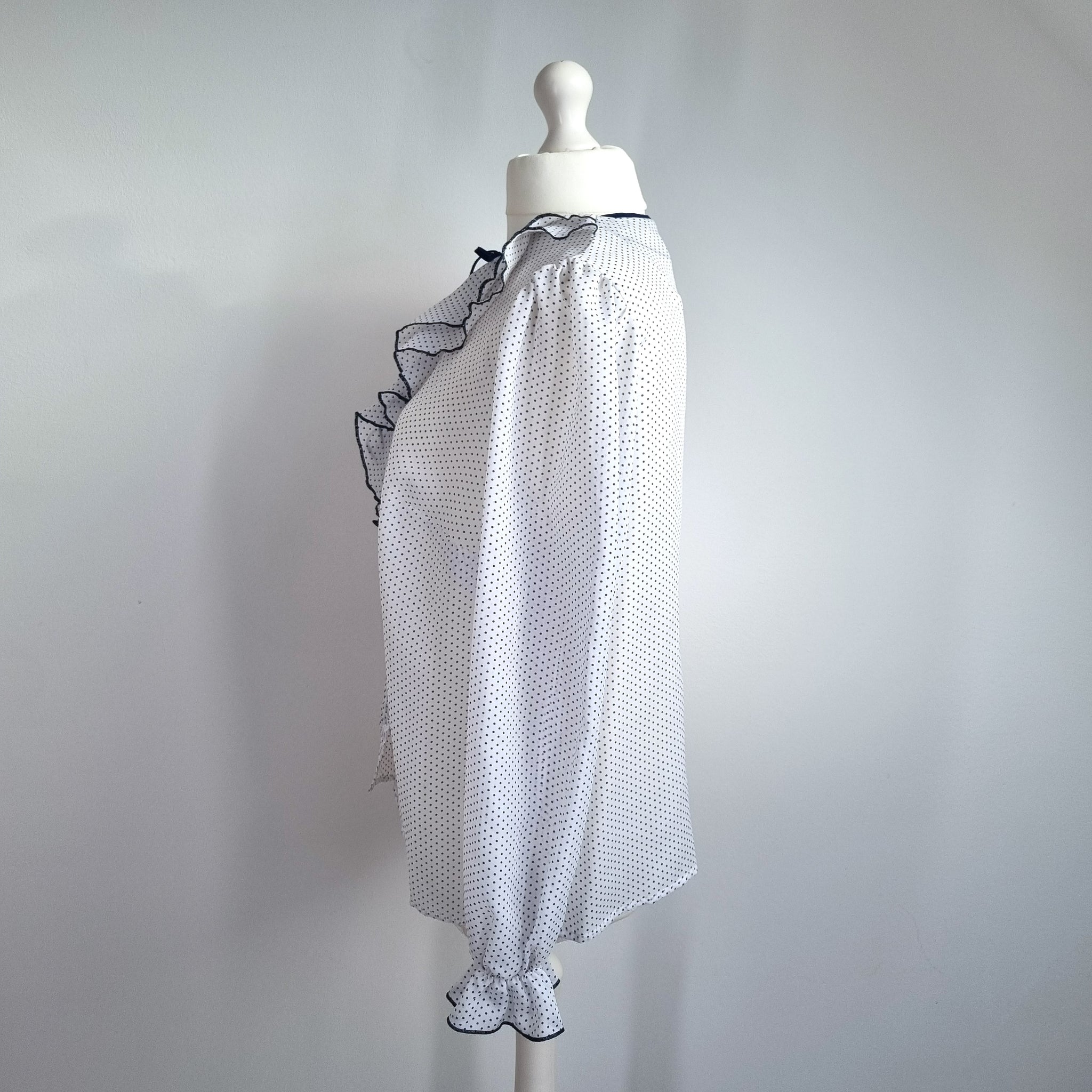 Vintage Blouse - Polka Dot Pattern - Ruffle Neck - Neckline Bow - White & Navy - Long Sleeves - Button Down