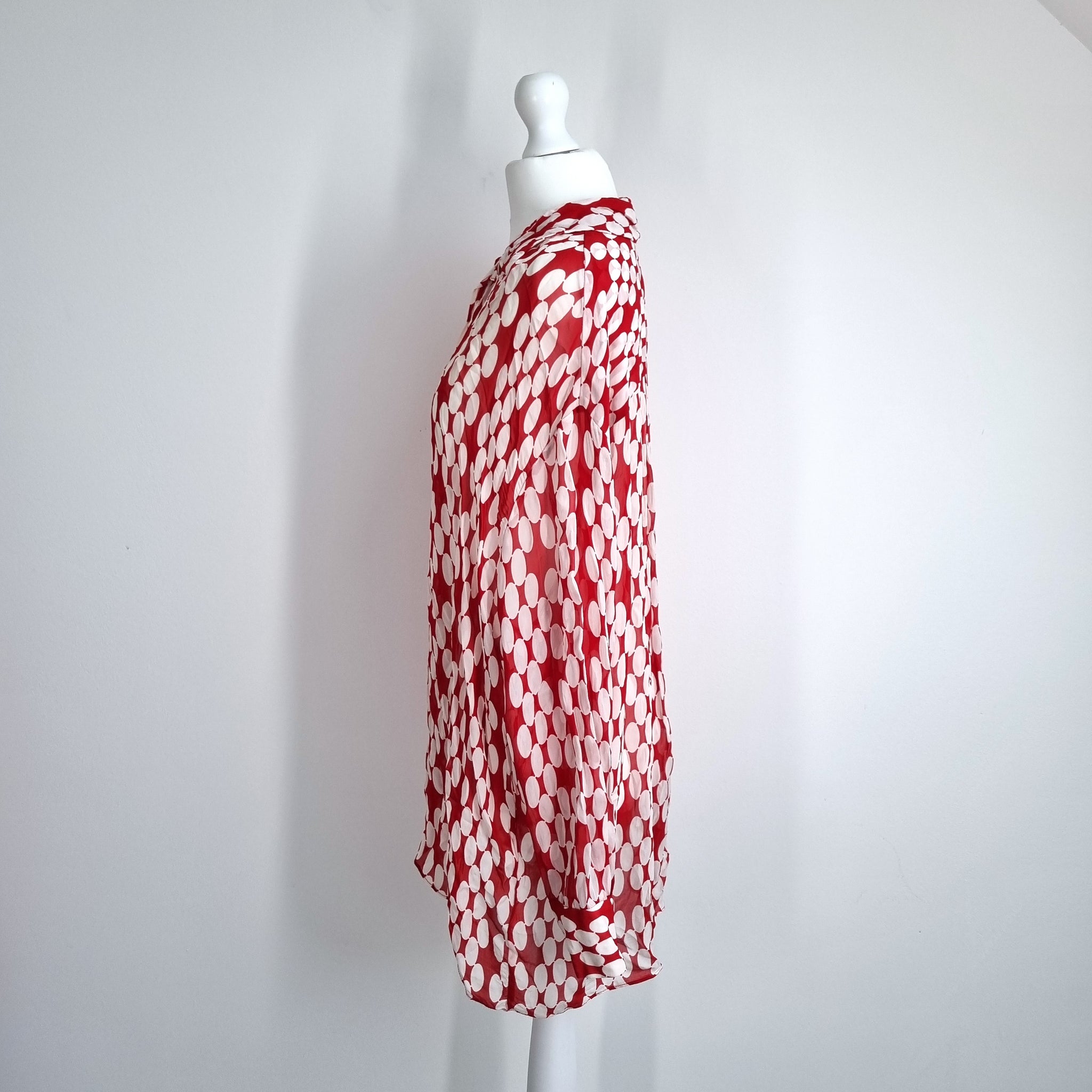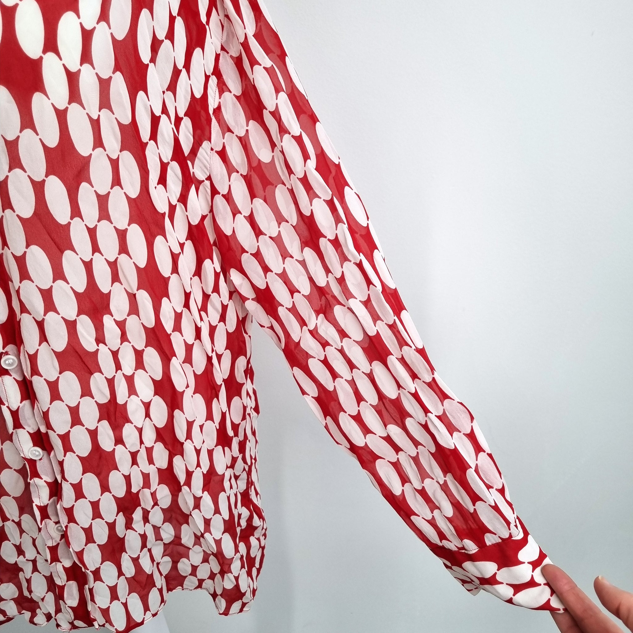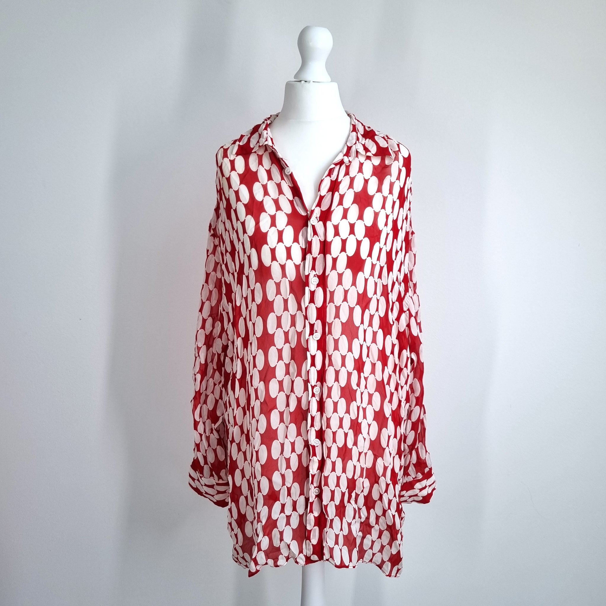 Zara Oversized Chiffon Shirt - Red & White - Large Retro Polka Dot Print - Tunic Length - Button Down - Long Sleeves - 100% Viscose