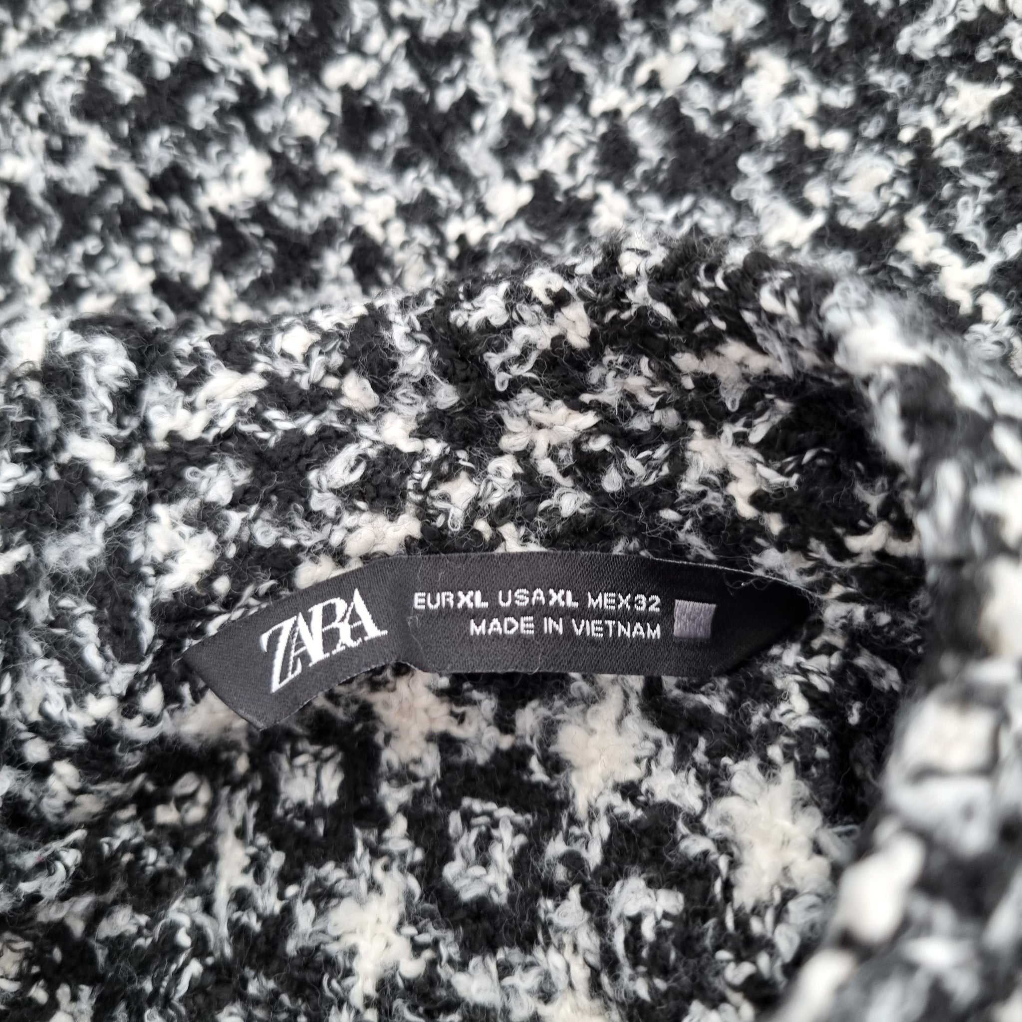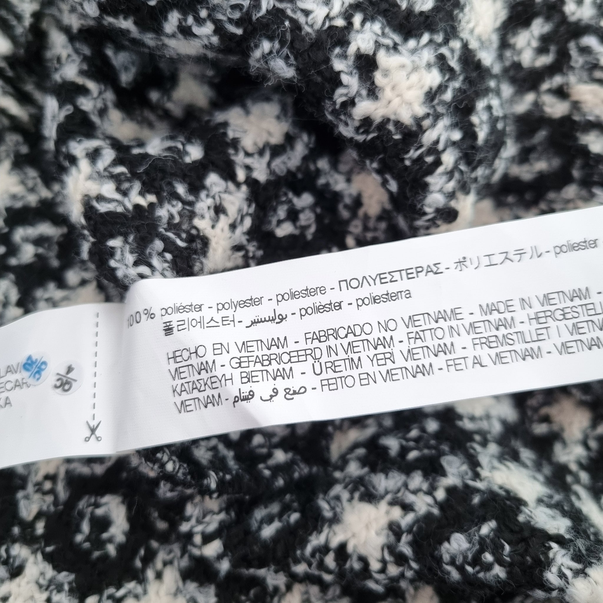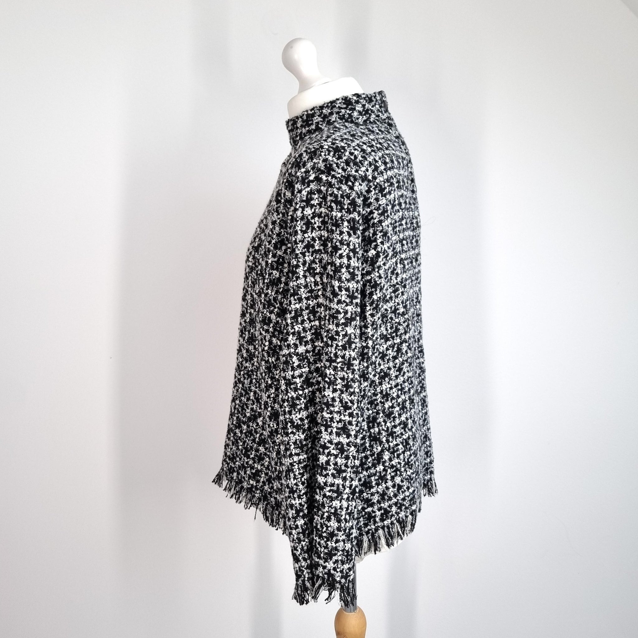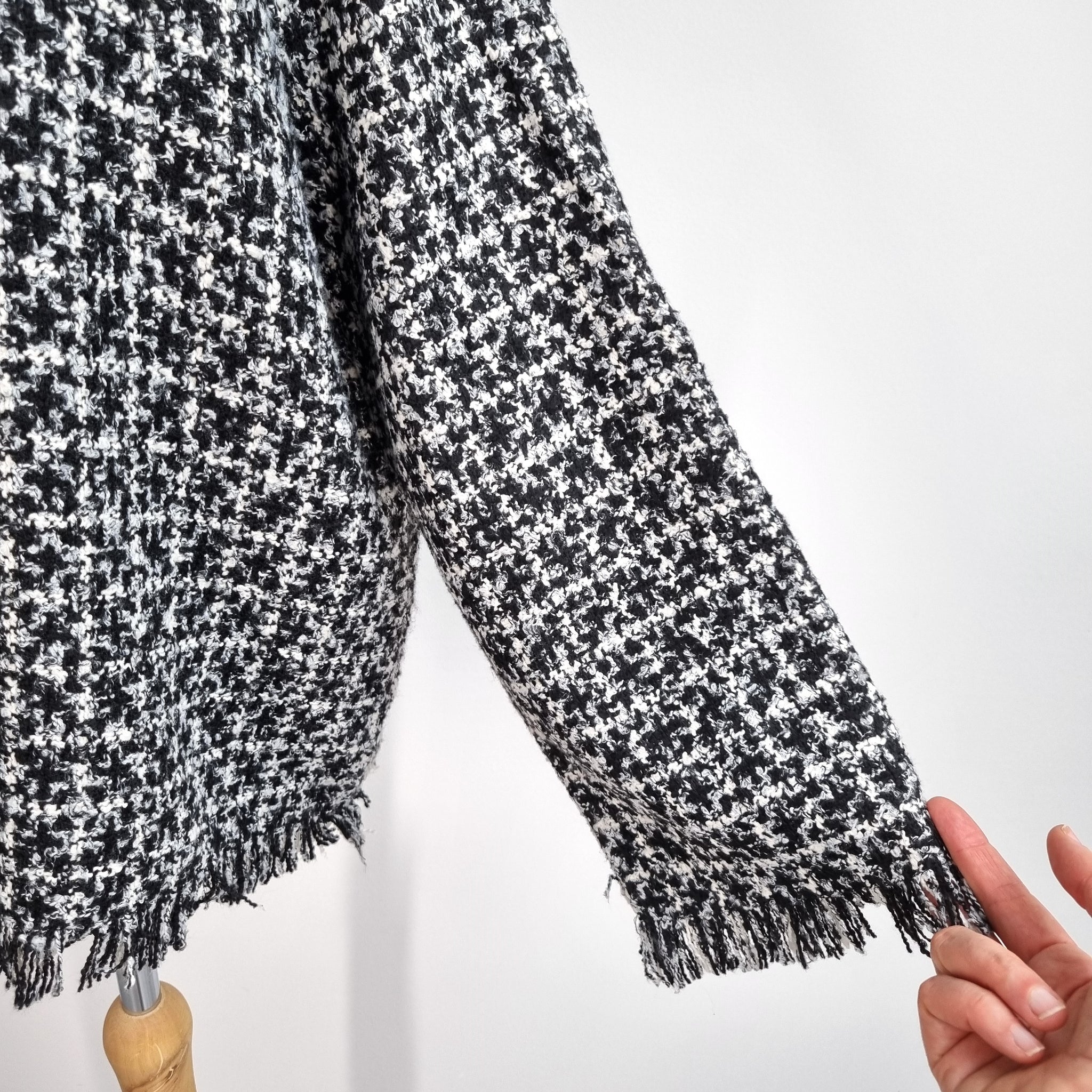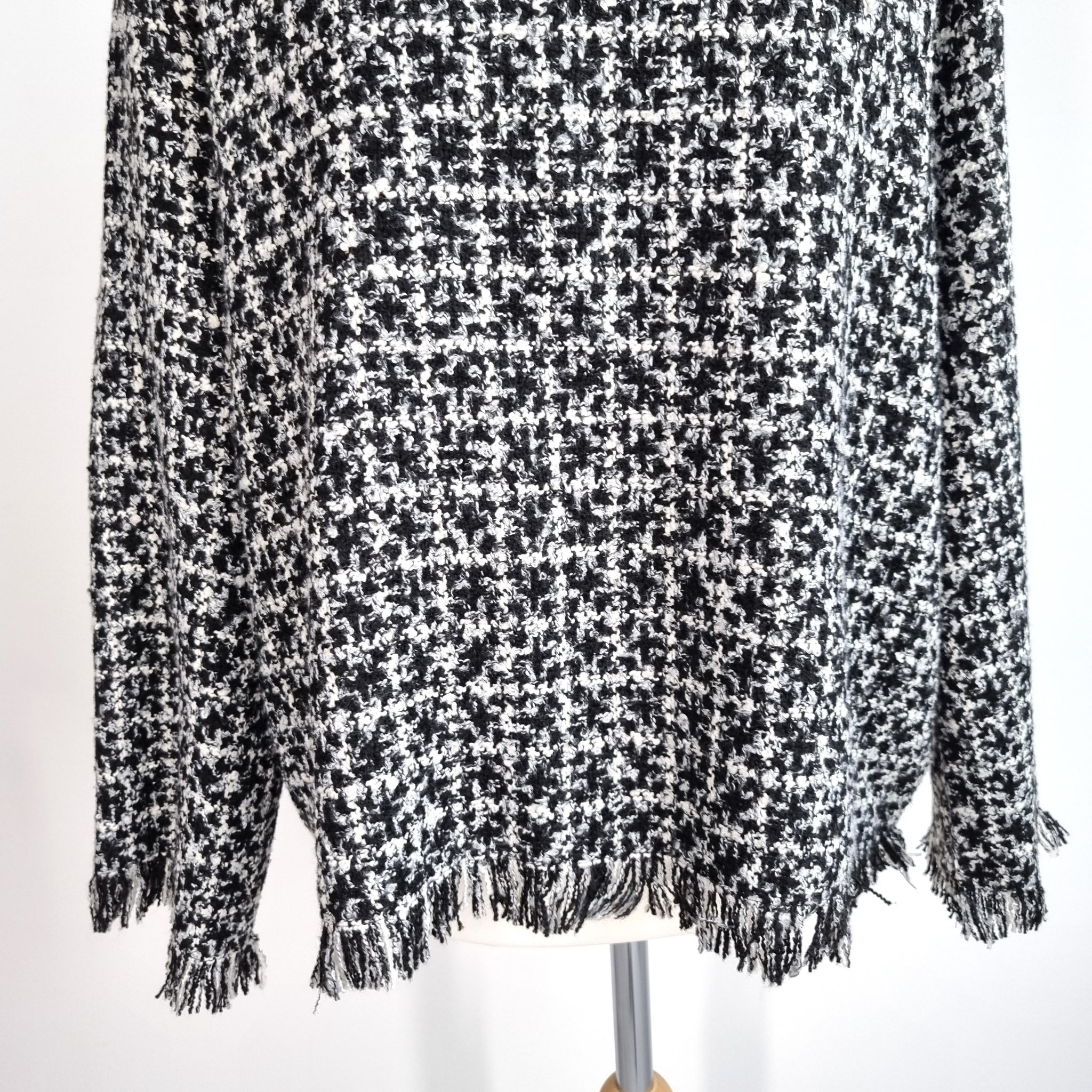 Zara Tweed Top - Fringed Hem - Long Sleeves - Black & White - Mock Neck - Back Neckline Buttons - Super Soft - Check Pattern Effect