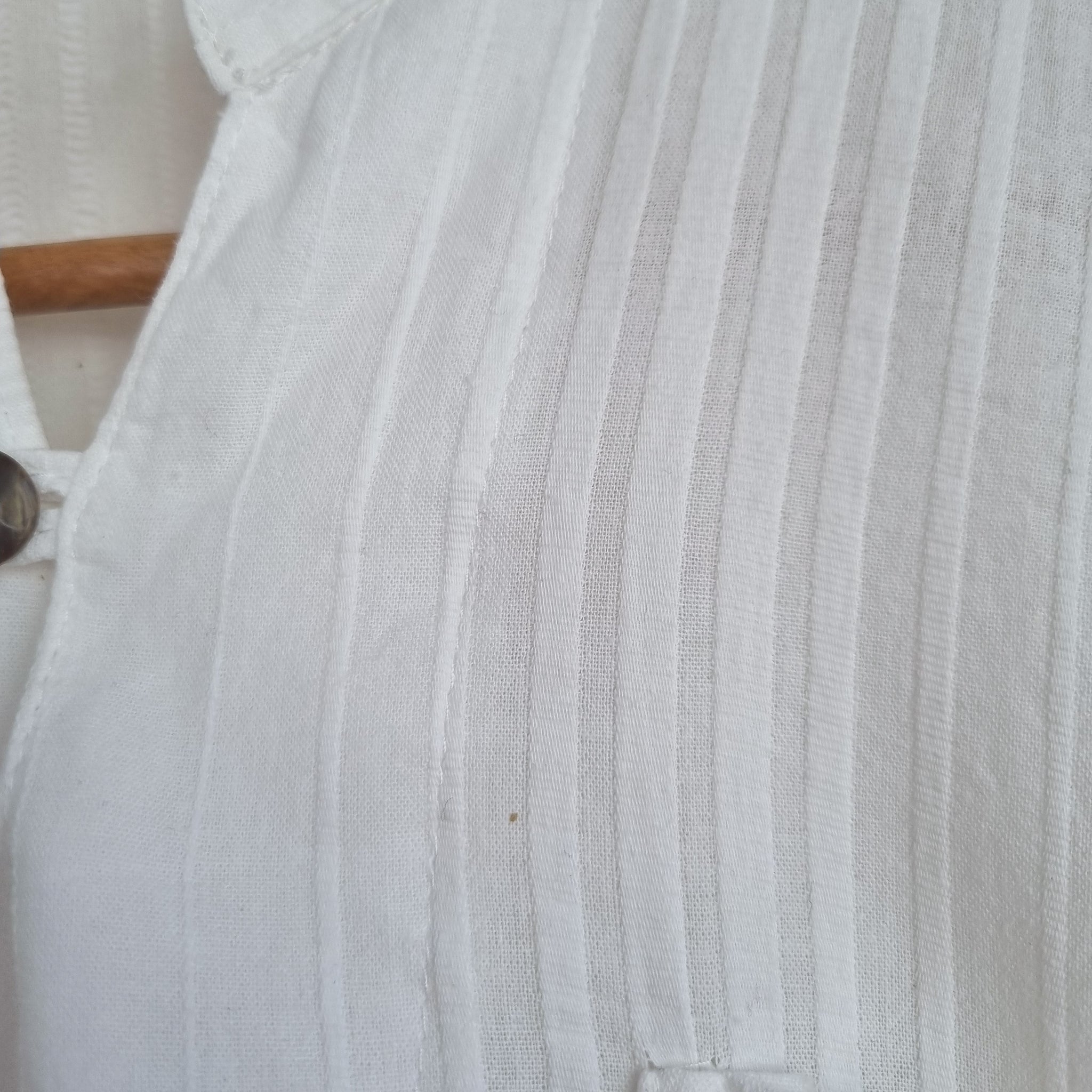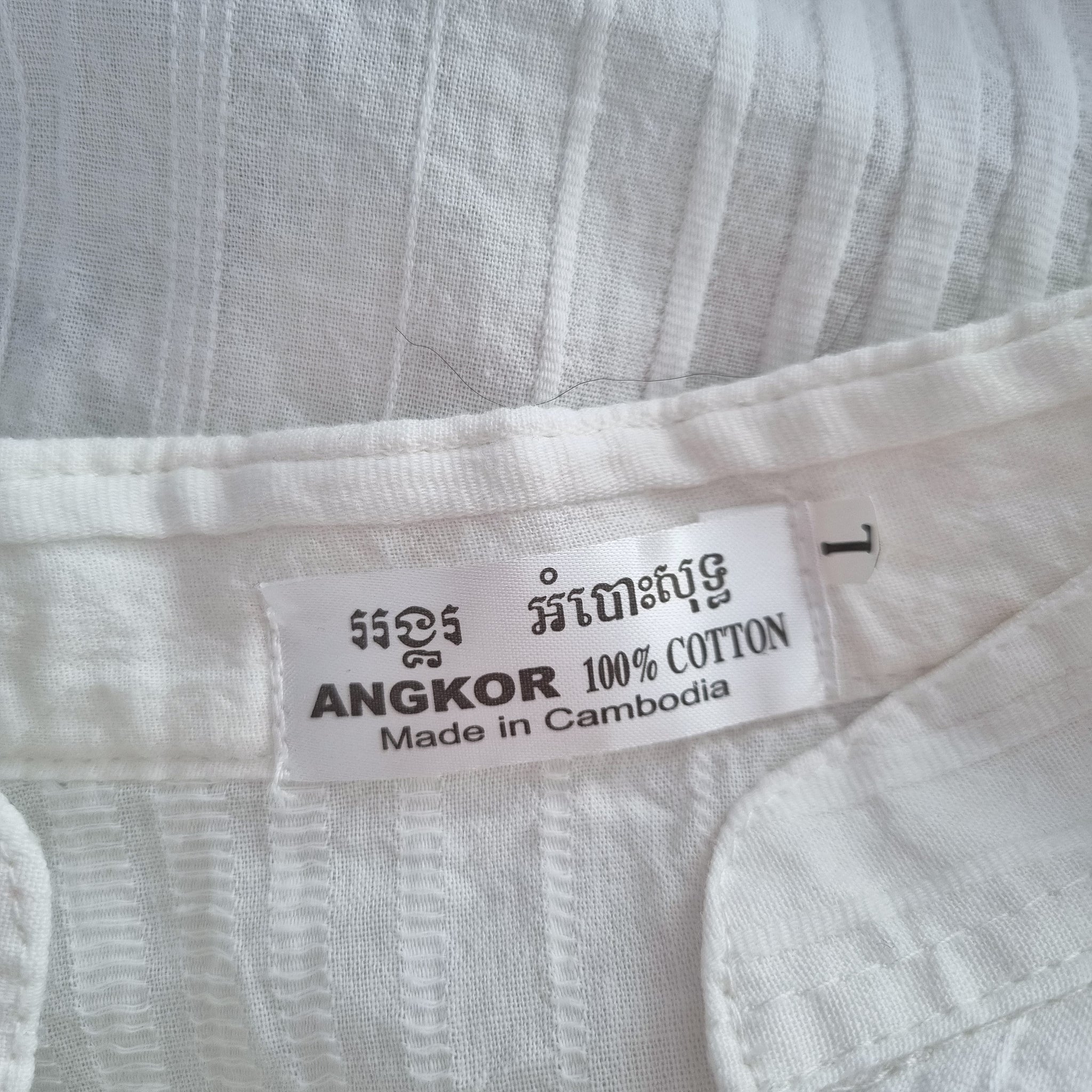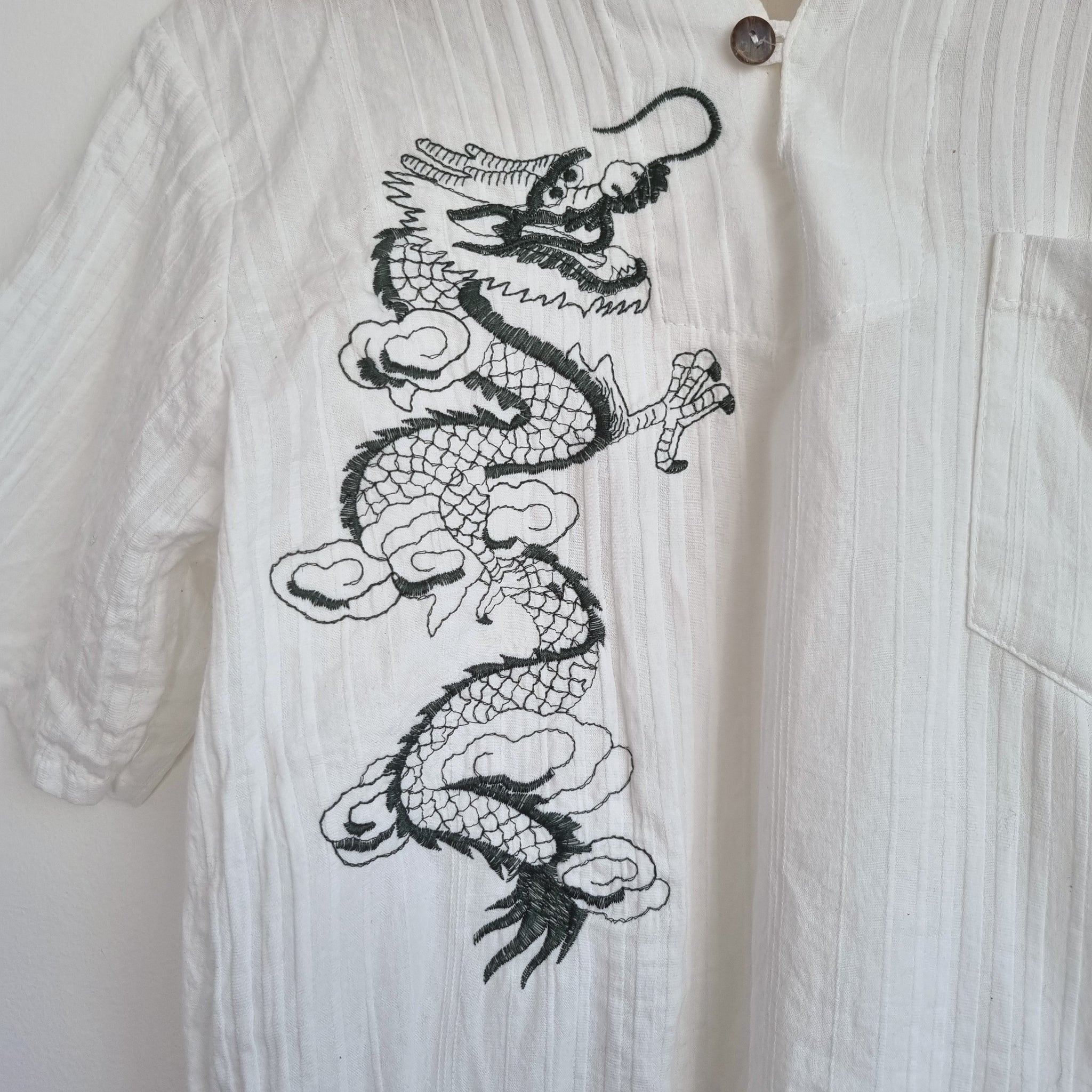 Angkor Men's Shirt - Embroidered Dark Green Dragon - Made in Cambodia - White - Mock Neck - 100% Cotton - Short Sleeves - Collar Button - Striped Pattern