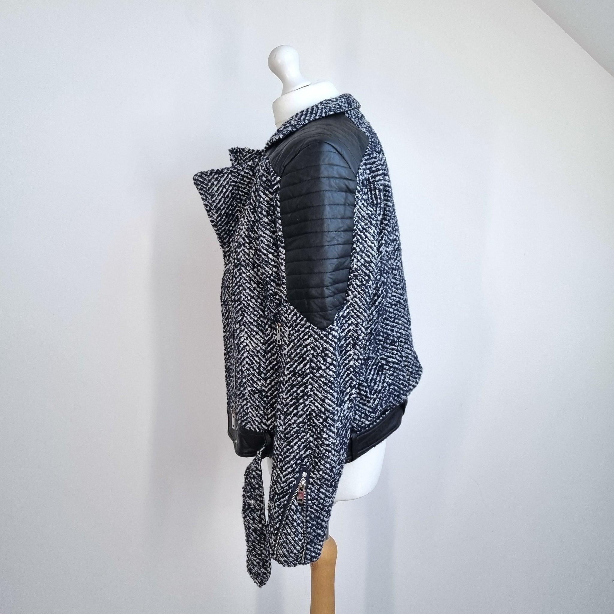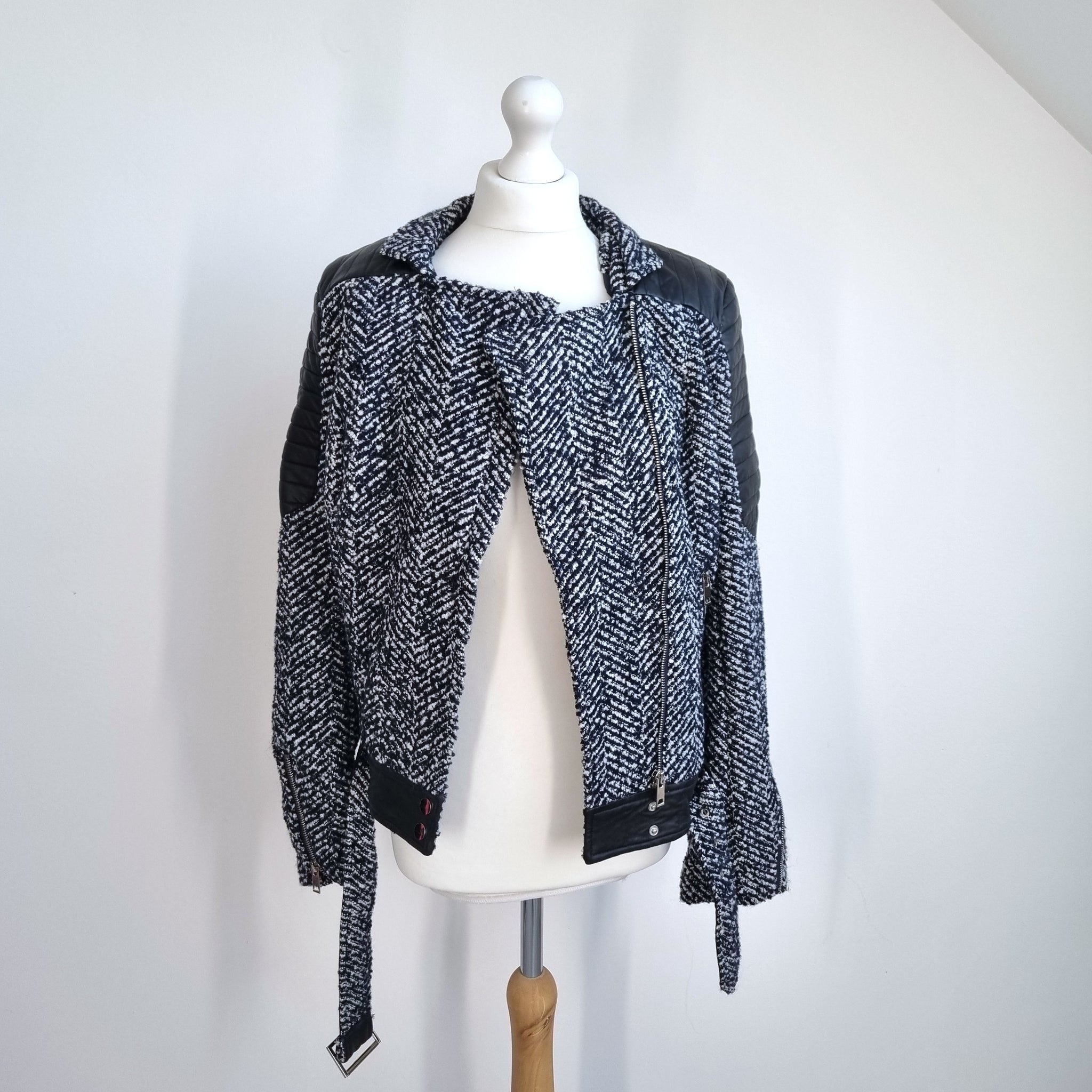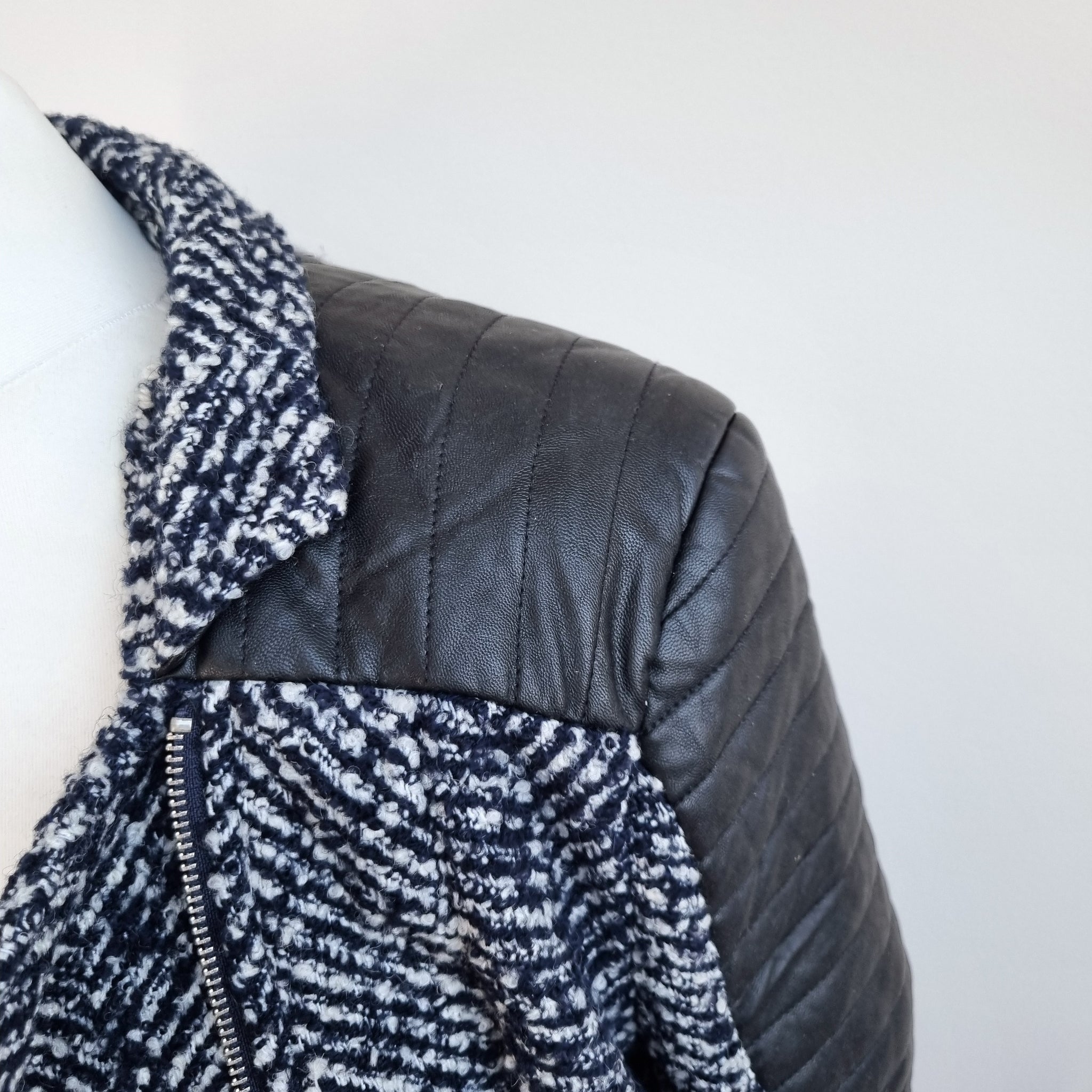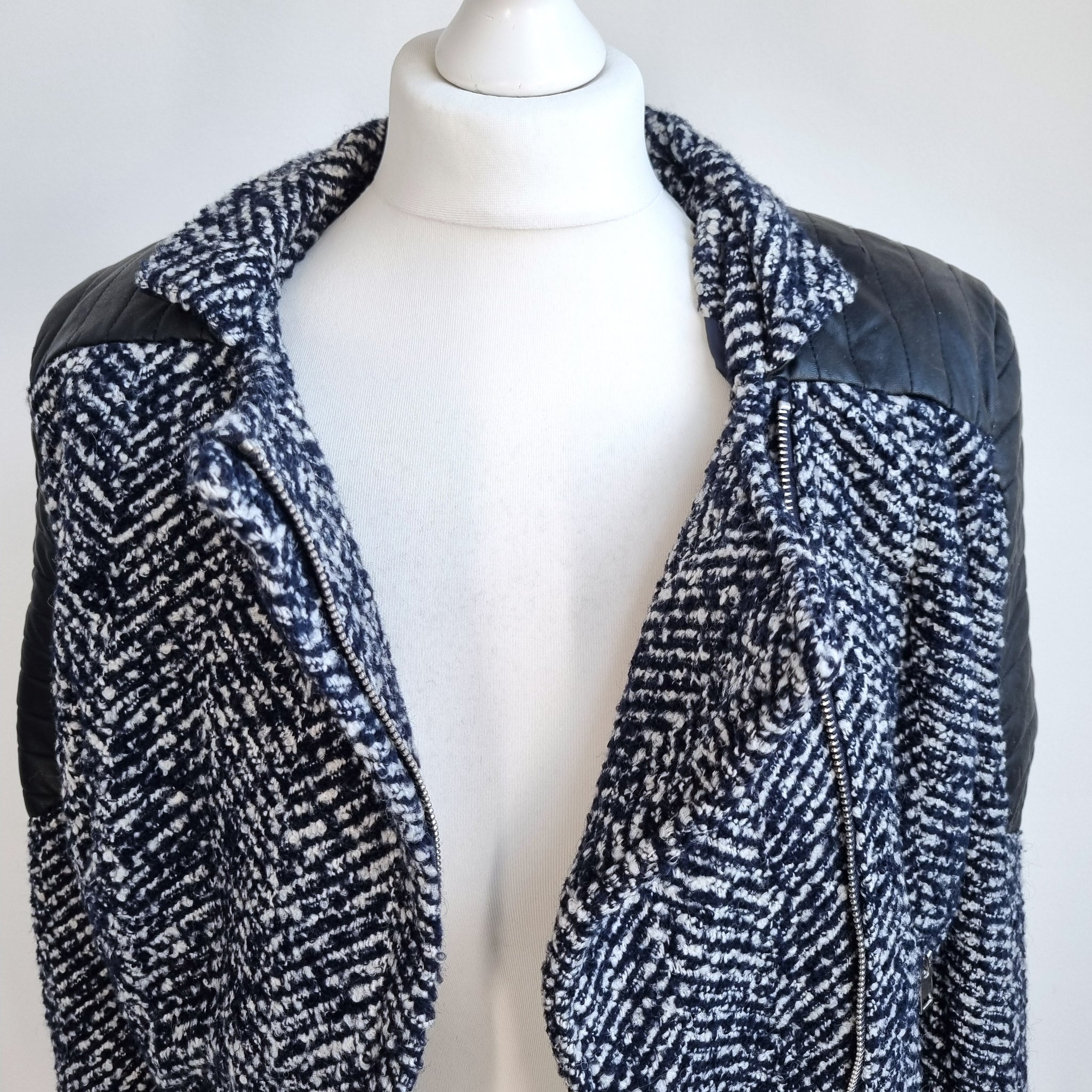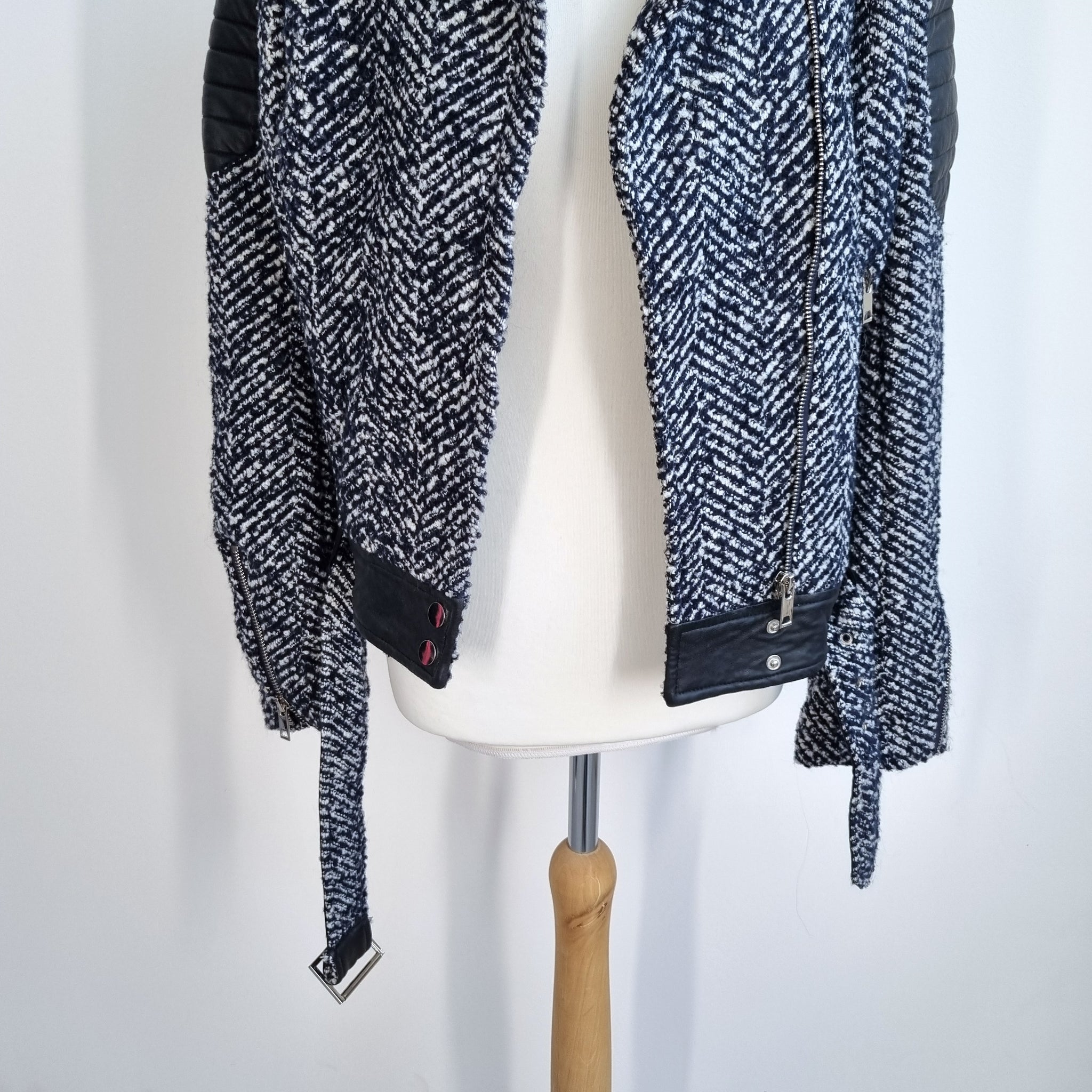 Capsule Biker Jacket - Tweed - Faux Leather Details - Navy Blue - Zipped Pockets - Lined - Belted - With Wool (35%)