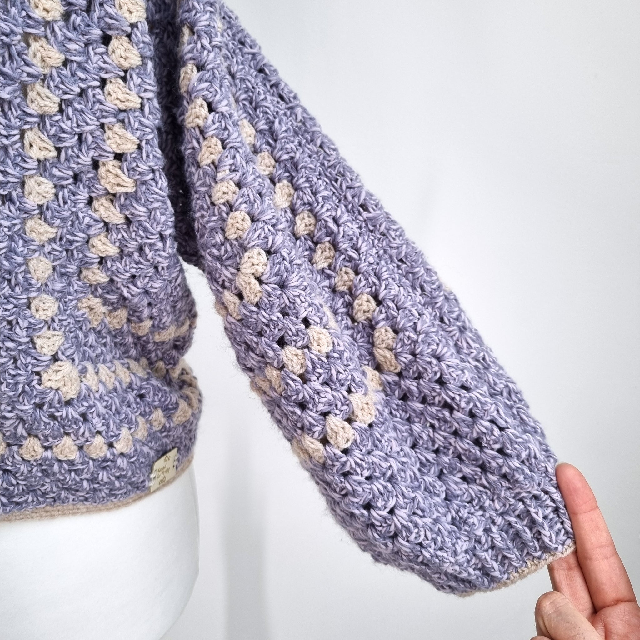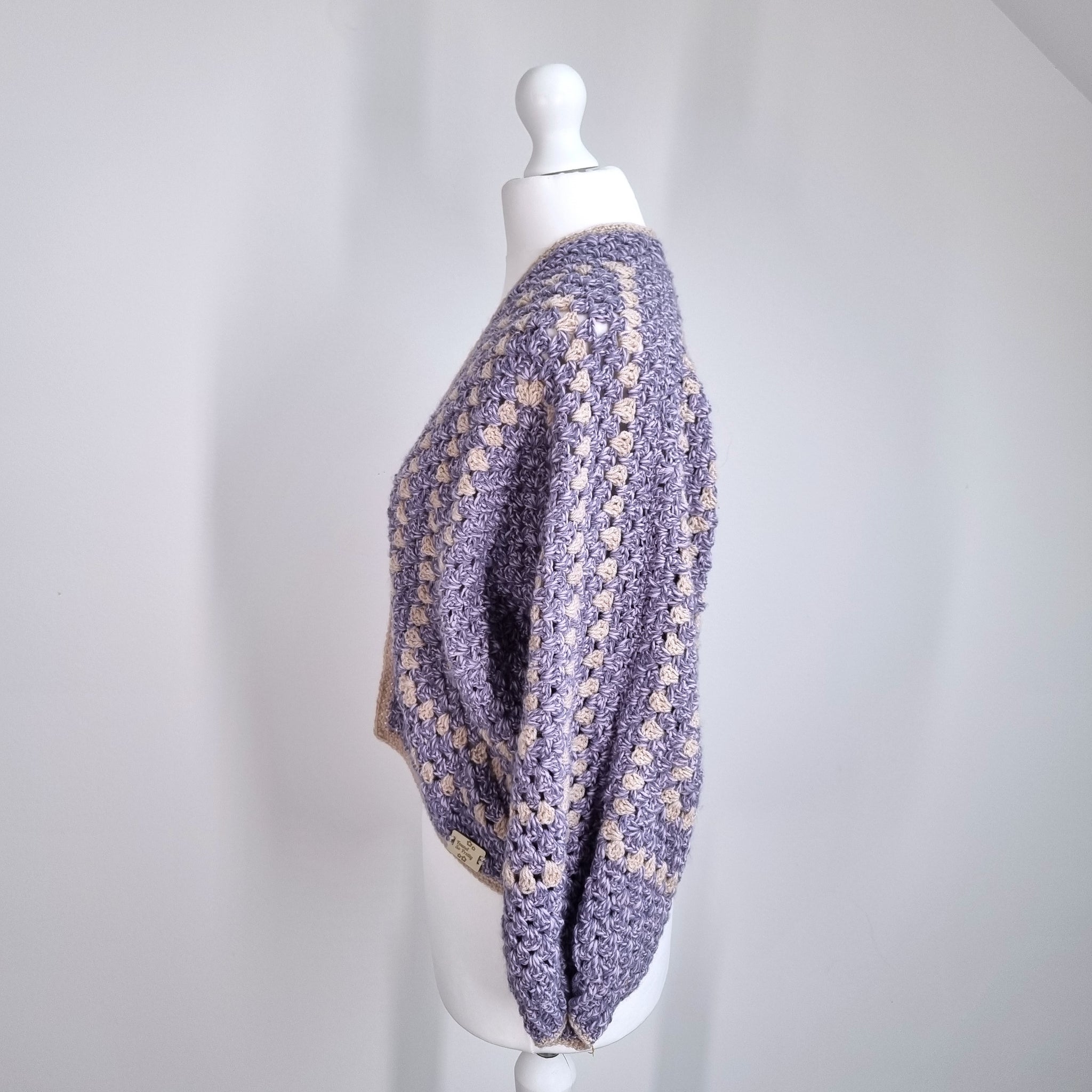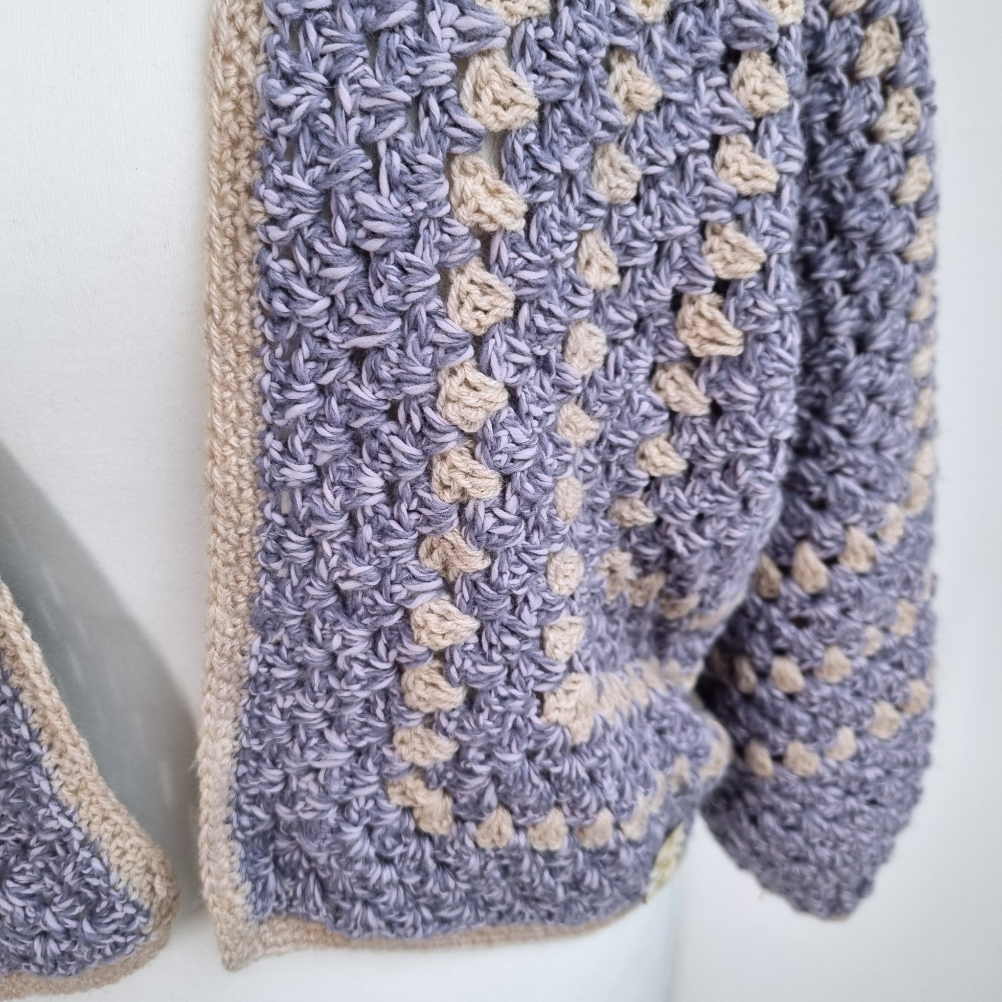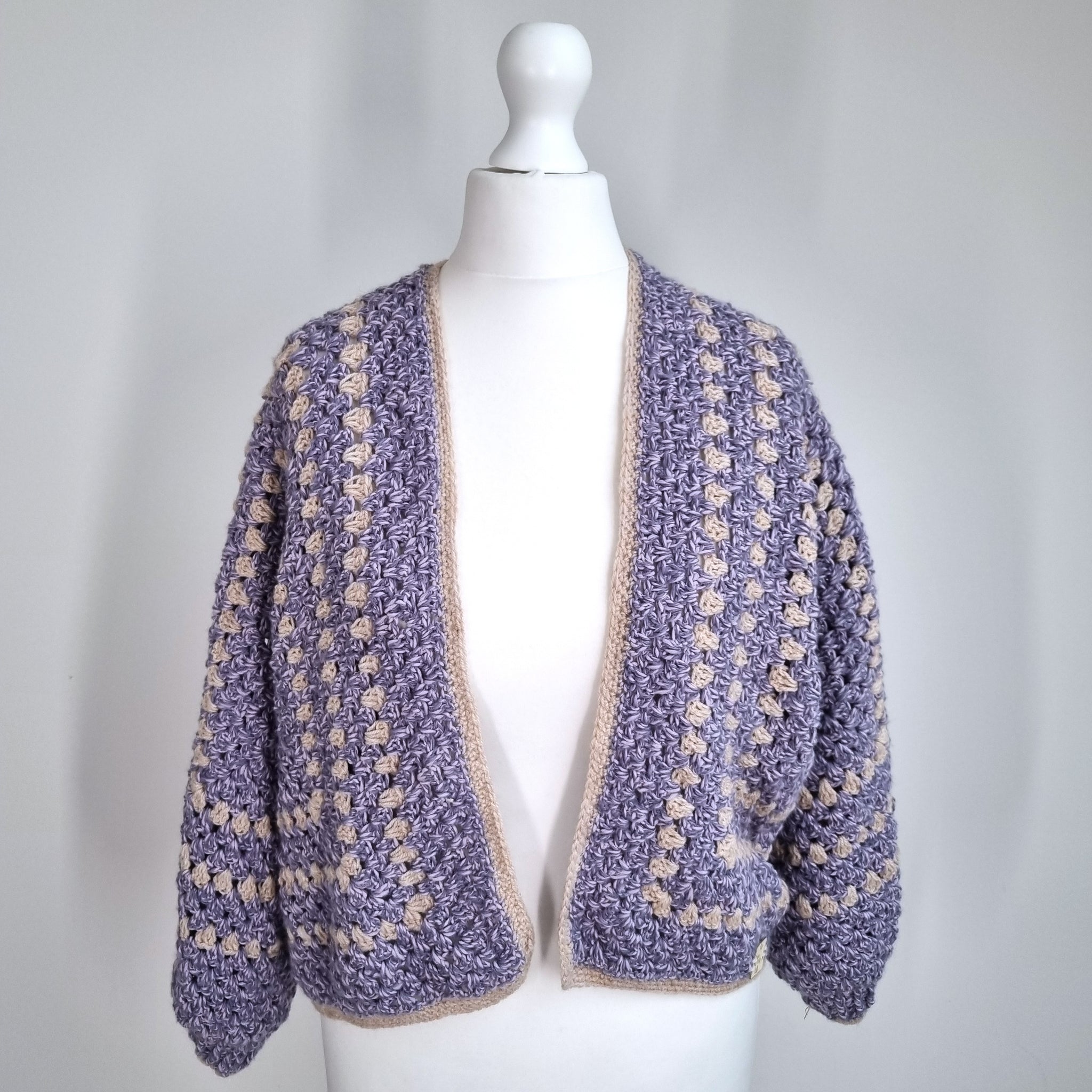 Handmade Crochet Hexagon Cardigan - Cropped - Chunky Knit - Boxy - Long Sleeves - Lilac Marl & Beige - Mixed Fibres - Open