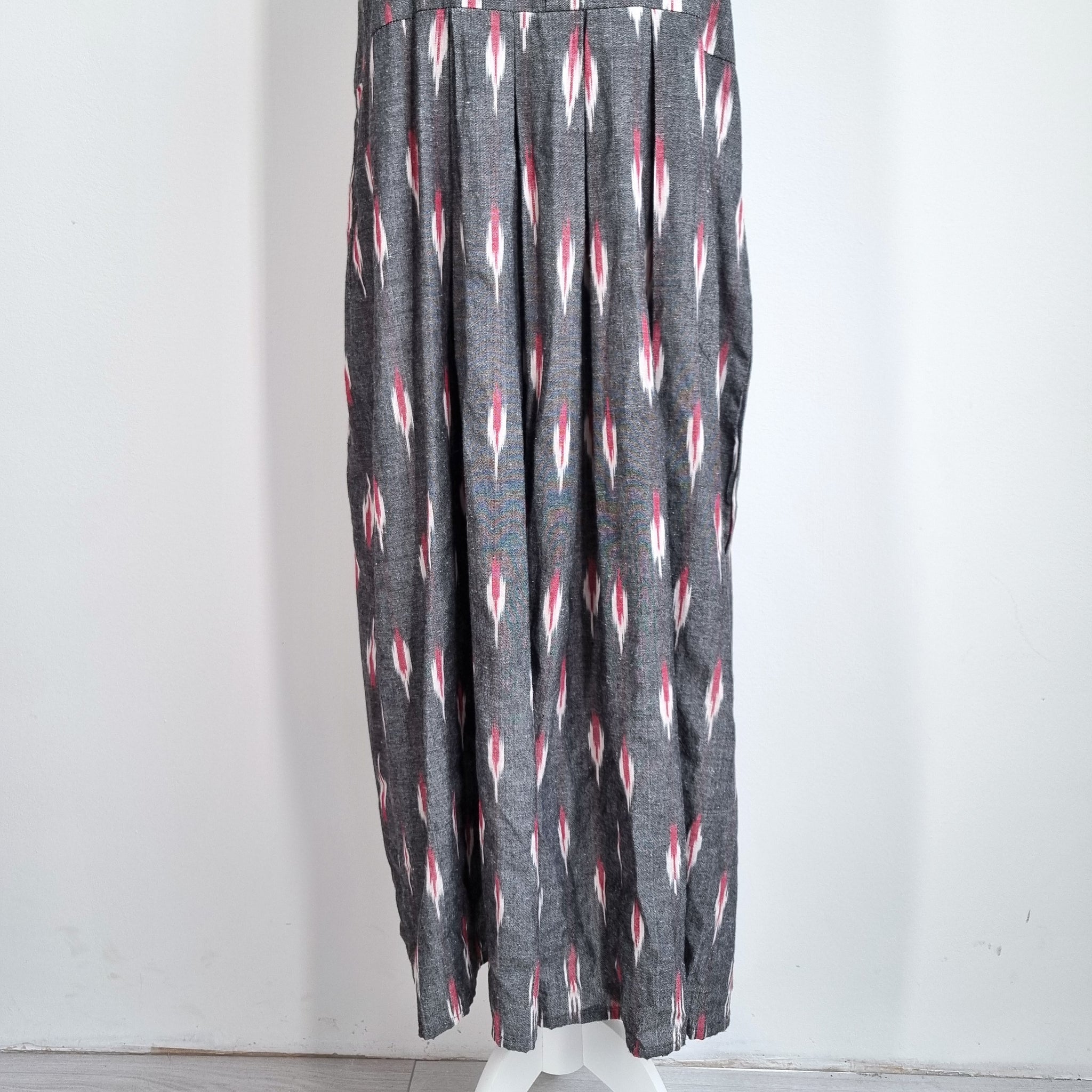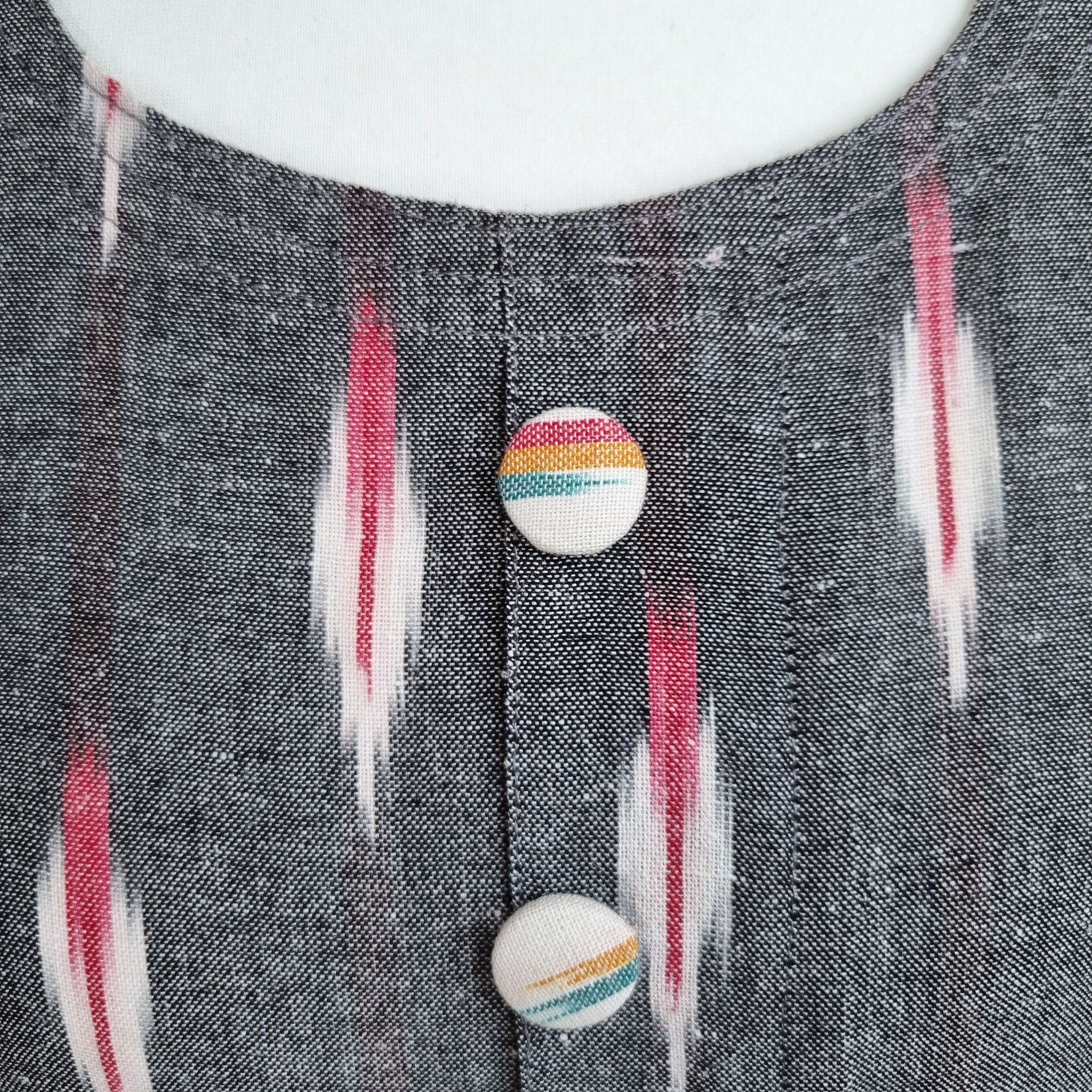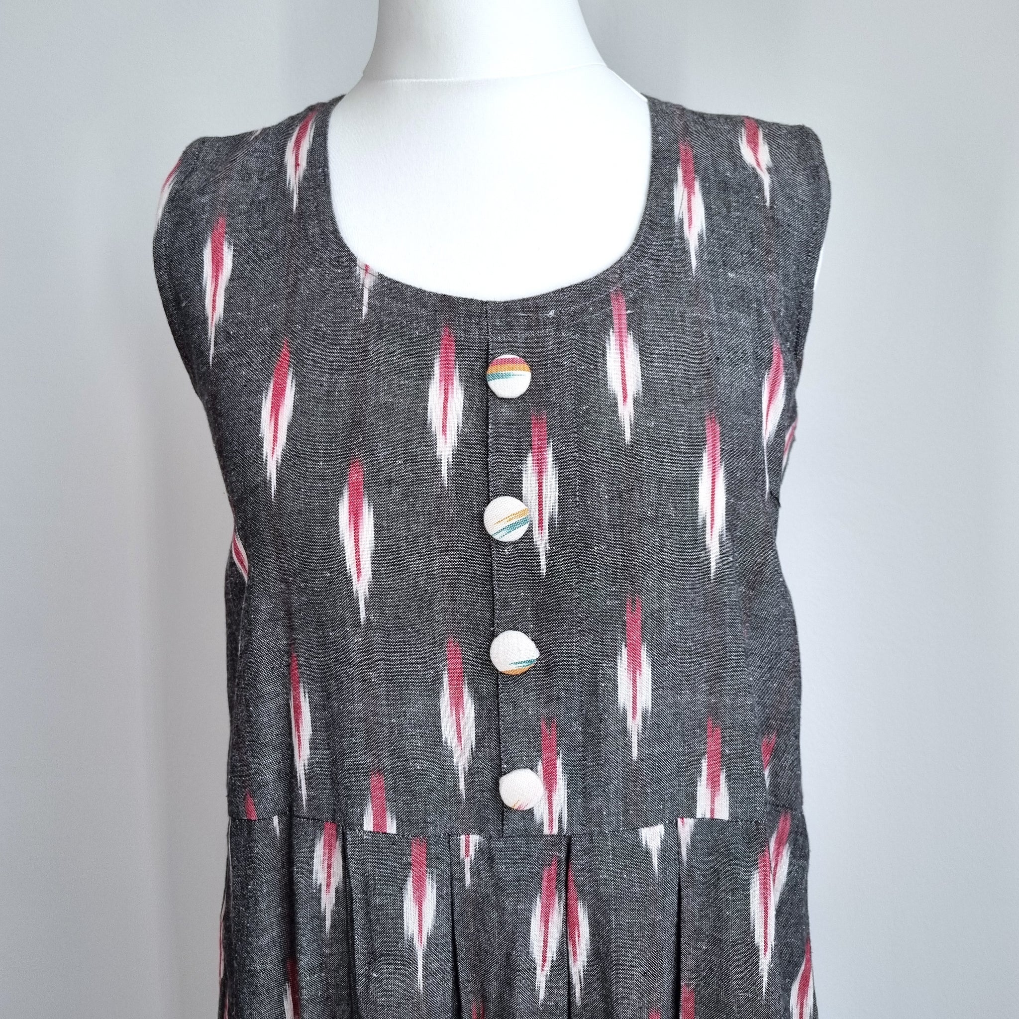 Handmade Midi Dress - Ikat Print - A Line - Grey - Cotton Blend - Decorative Button Detail