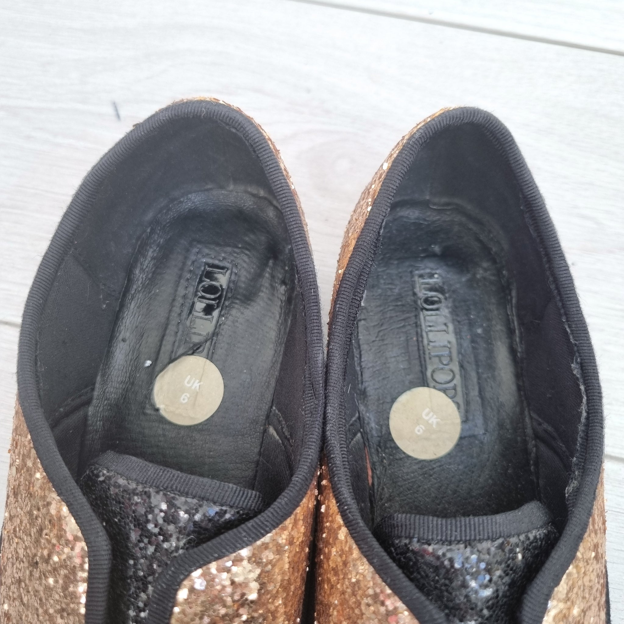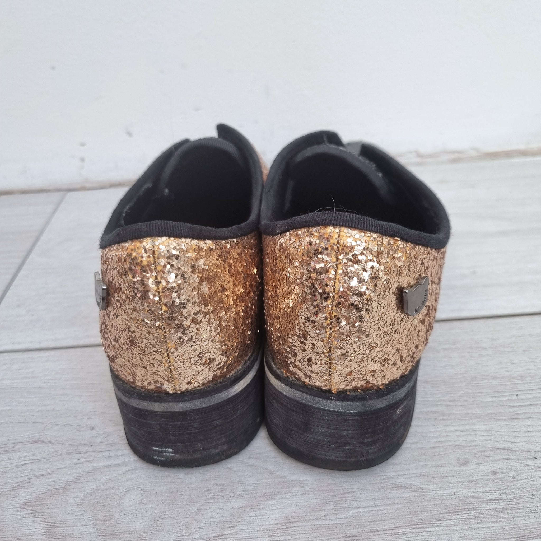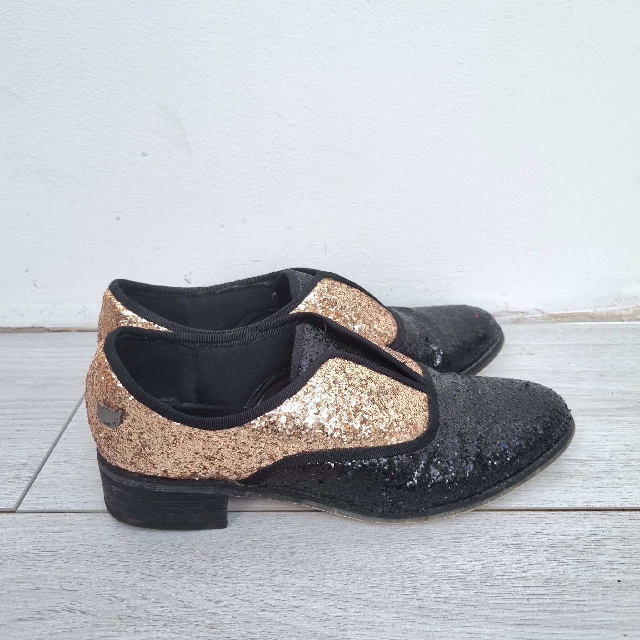 Lollipops Ladie's Brogue Shoes - Glitter - Small Heel - Gold & Black - Leather Upper - No Lace Design - Cute Cat Logo