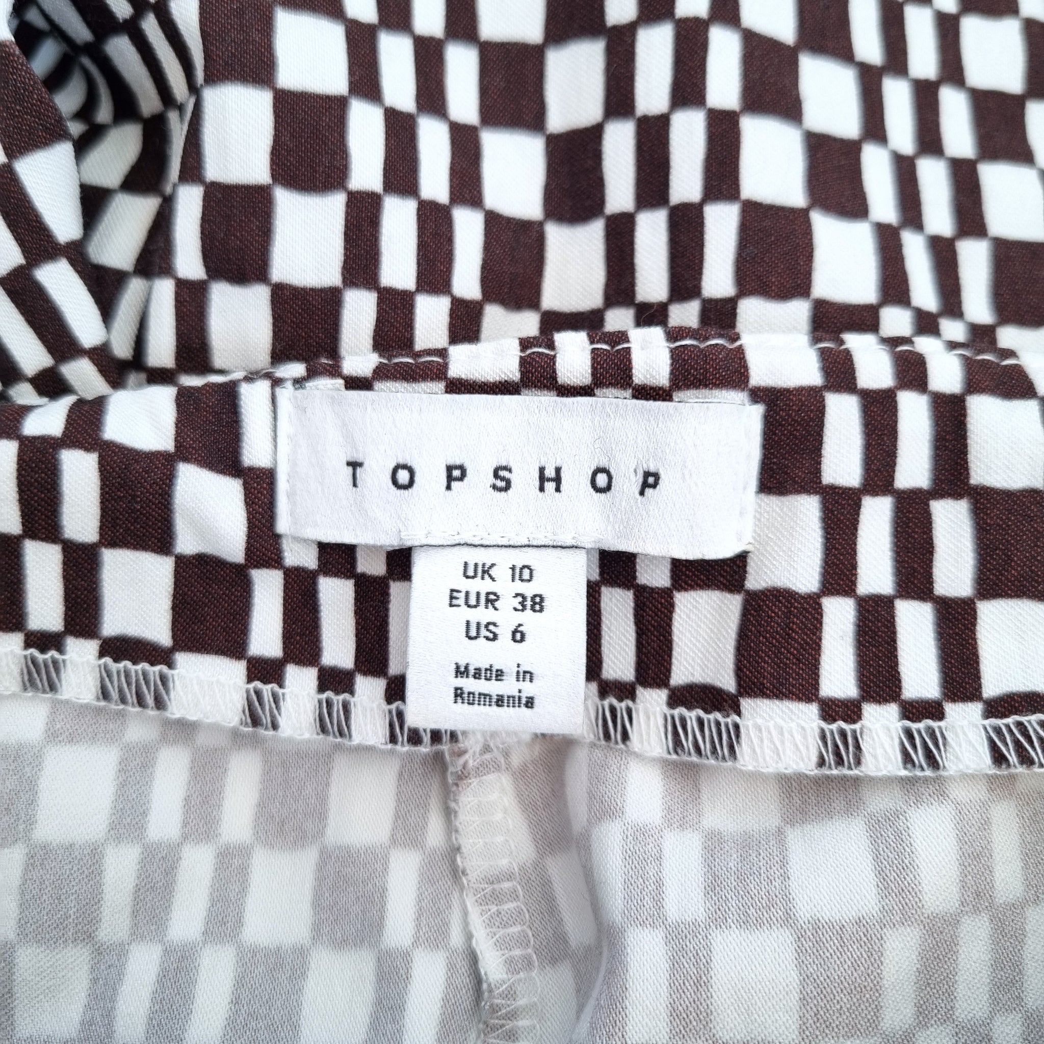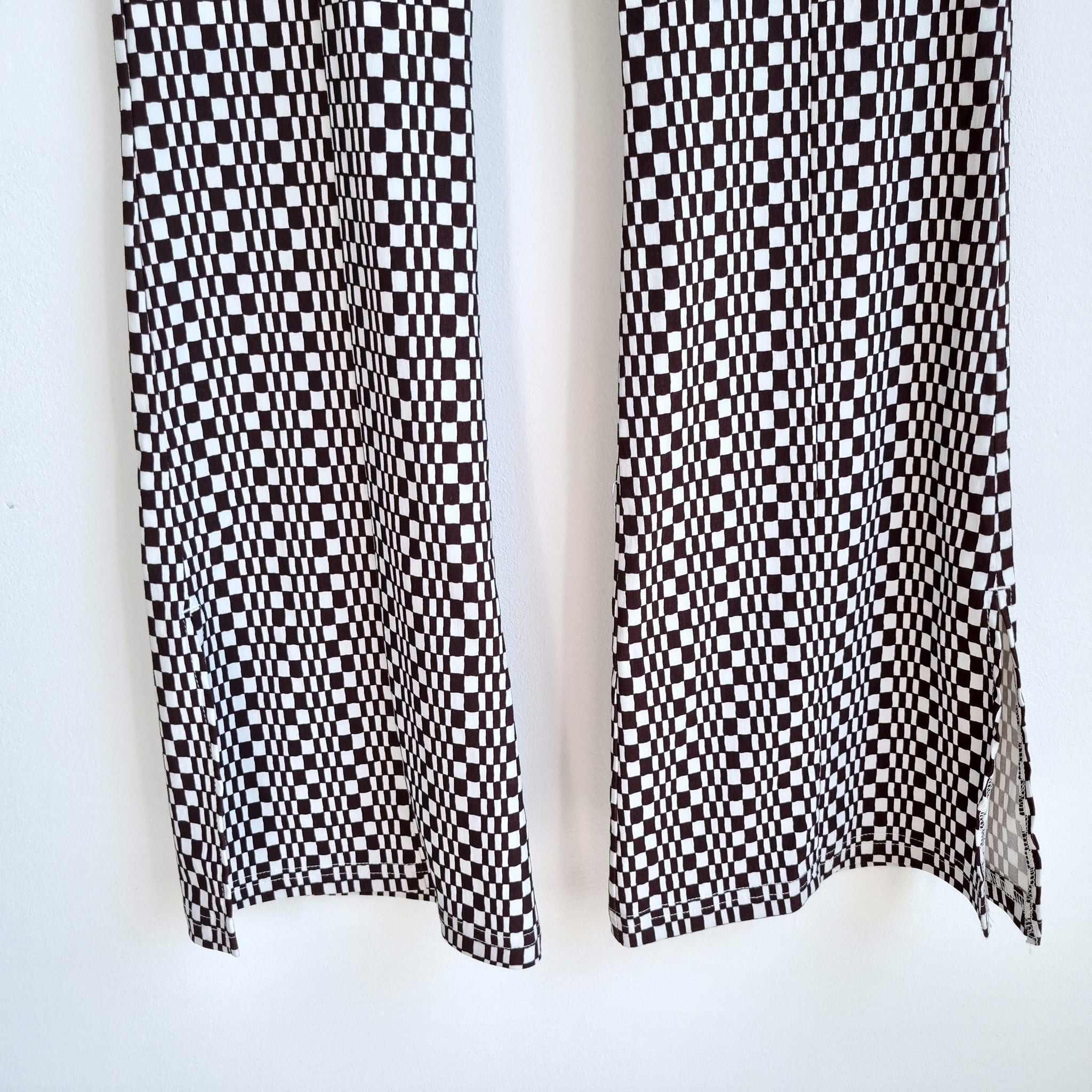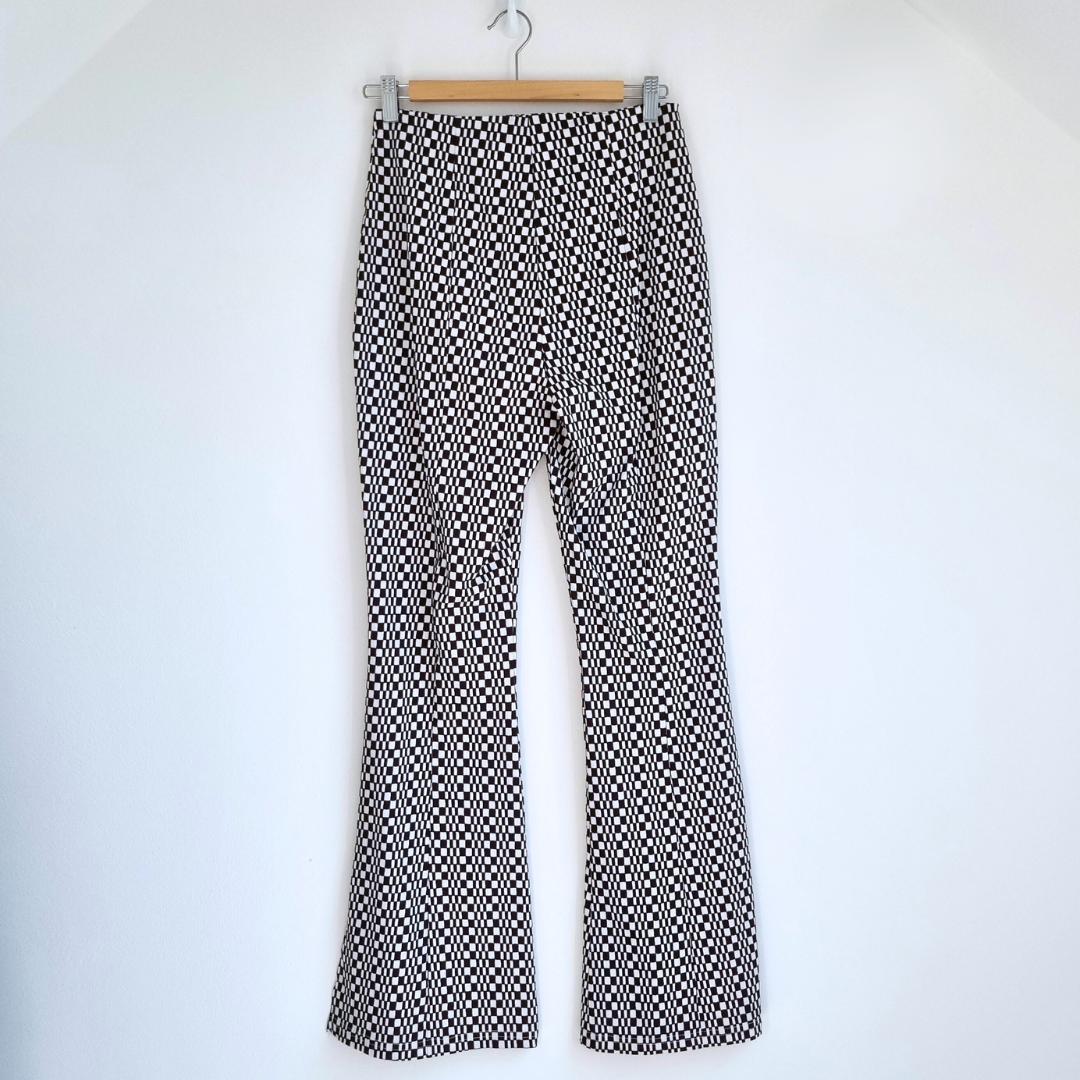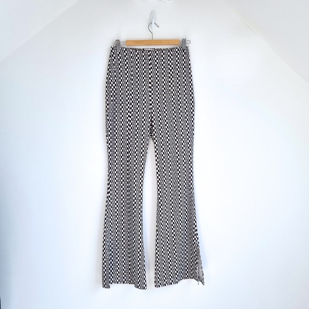 Topshop Trousers - Flared Bellbottoms - Check Pattern - Brown & White - Stretch - High Rise - Hem Slit